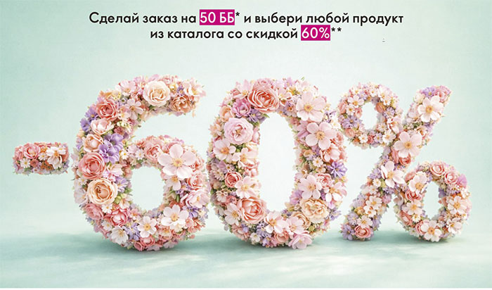С 8 по 15 марта включительно оформите единовременный заказ на 50 Баллов Бонуса и получите возможность заказать любой продукт из каталога №4 со скидкой 60%.