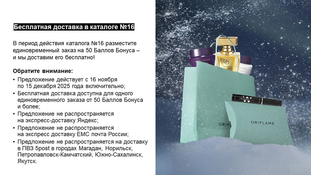 С 16 ноября по 6 декабря 2025 года единовременный заказ от 50 Баллов Бонуса будет доставлен бесплатно.