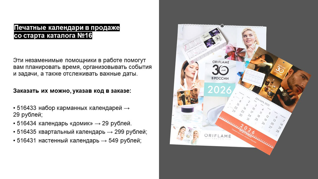 Печатные календари в продаже со старта каталога №16. Заказать их можно, указав код в заказе: