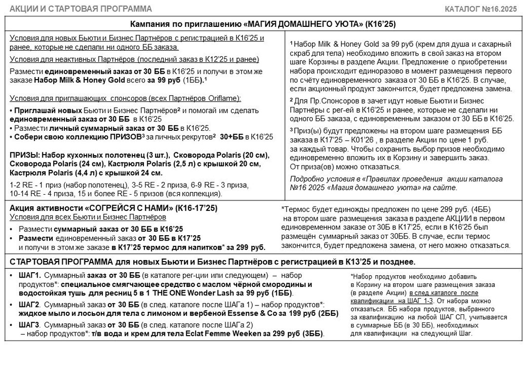 Акции и программы для консультантов в каталоге Oriflame 16 2025 с 16 ноября по 6 декабря 2025 года. Список обновляется. Новые акции добавляются в начало.