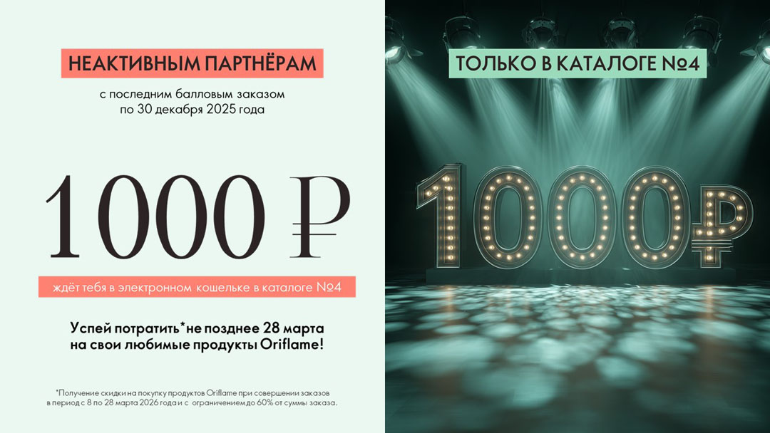 2 Всем неактивным Партнёрам с указанным периодом неактивности единожды предоставляется сумма в размере 1000 рублей на электронный кошелёк Oriflame, которую они могут использовать получением скидки на покупку продуктов Oriflame при совершении заказов в период действия Каталога №4 (с 8 по 28 марта 2026 года), и с ограничением до 60% от общей суммы заказа. Если заказ с использованием данной суммы был полностью отменён в каталоге его размещения, то возможность использования предоставленной суммы снова будет доступной. В случае не размещения ни одного заказа в период с 8 по 28 марта 2026 года включительно, не использованная сумма 1000 рублей на электронном кошельке сгорает. В случае, если предоставленная сумма в 1000 рублей не будет выбрана полностью в период с 8 по 28 марта 2026 года, то неиспользованный остаток от этой суммы сгорает.