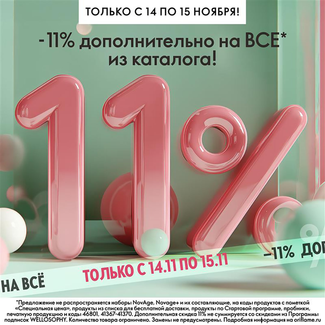 С 14 по 15 ноября включительно действует дополнительная скидка 11% на все продукты из действующего каталога.