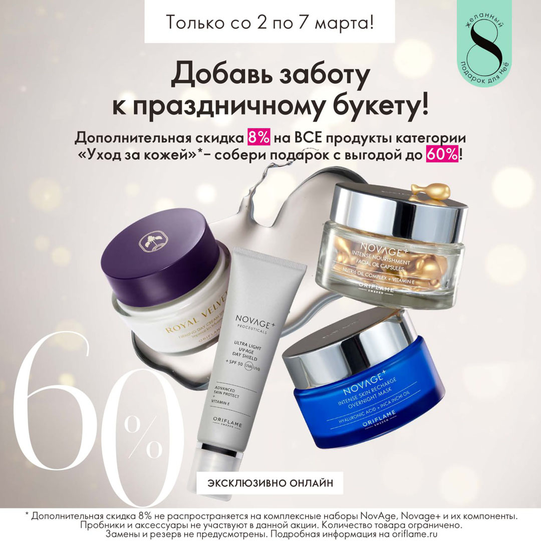 С 2 по 7 марта включительно действует дополнительная скидка 8% на все продукты категории «Уход за кожей» из каталога №3.