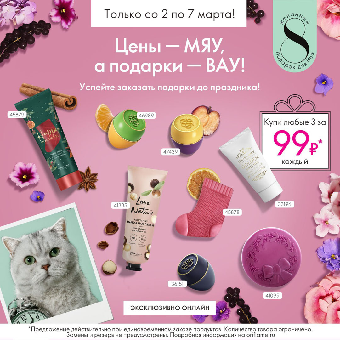С 2 по 7 марта включительно действует специальное предложение на продукты Oriflame. Полный список продуктов-участников акции доступен на сайте oriflame.ru.