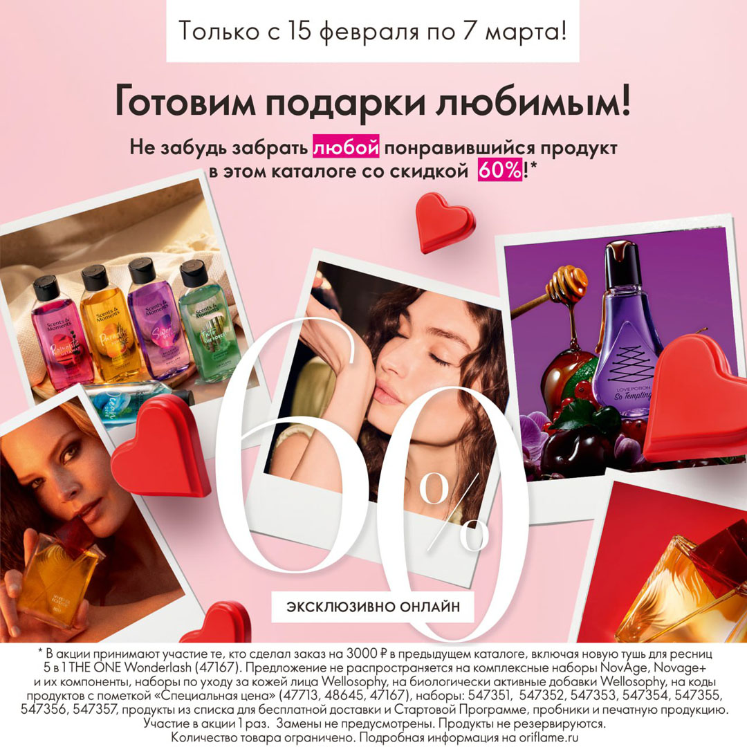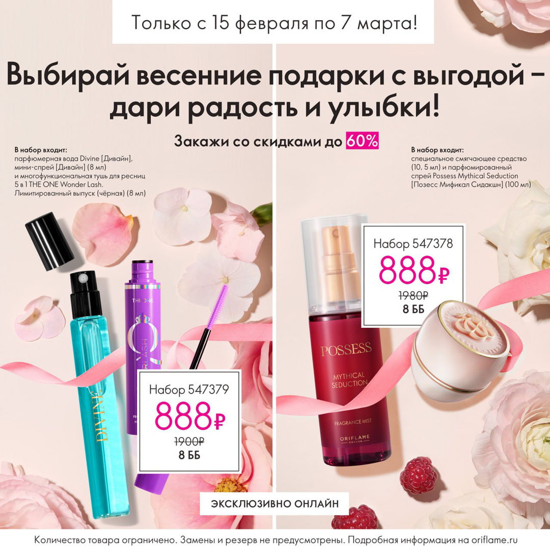 С 15 февраля по 7 марта включительно действует специальное предложение на продукты Oriflame. Полный список продуктов-участников акции доступен на сайте oriflame.ru.