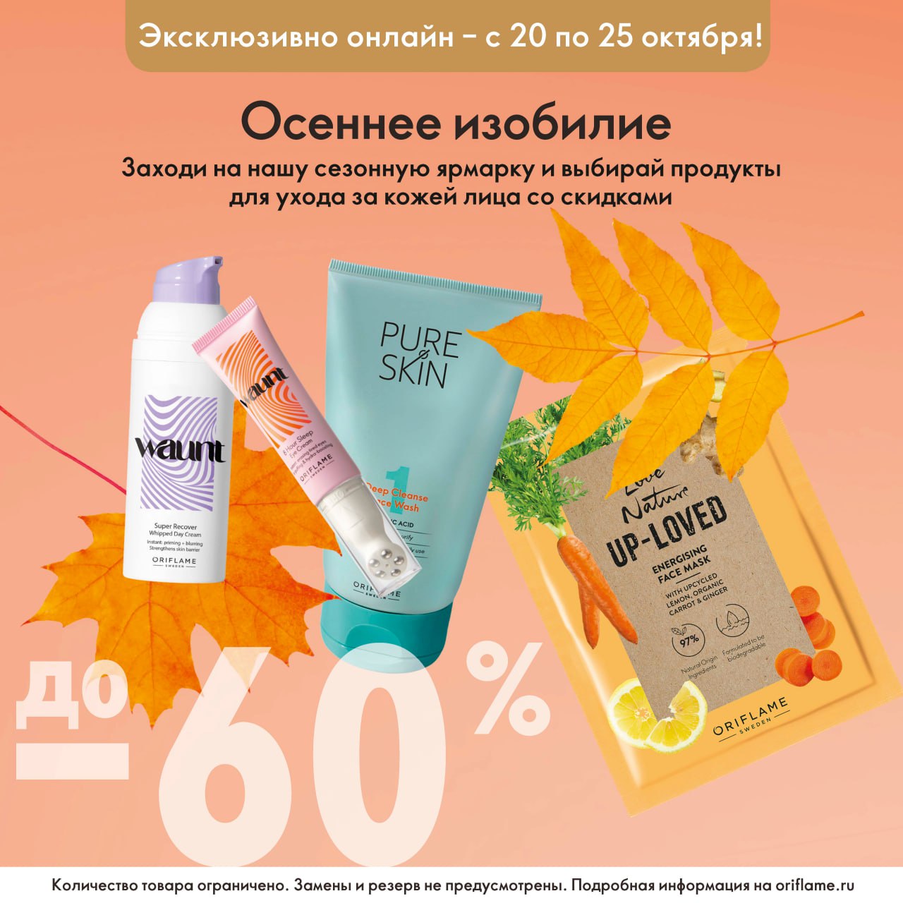 С 20 по 25 октября включительно действуют скидка до 60% на продукты для ухода за кожей лица.