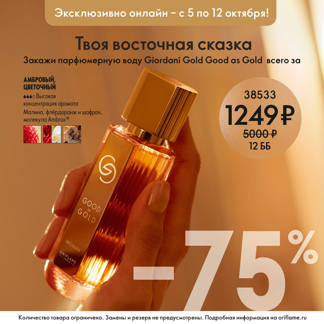 С 5 по 12 октября включительно вы можете заказать парфюмерную воду Giordani Gold Good as Gold со скидкой 75% всего за 1249 рублей.