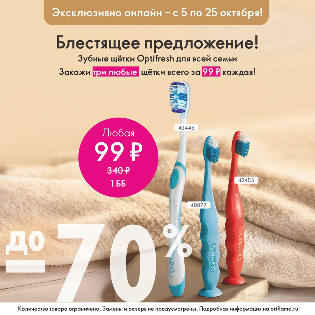 С 5 по 25 октября включительно при единовременном заказе любых трёх щёток Optifresh каждая обойдётся вам всего за 99 рублей.
