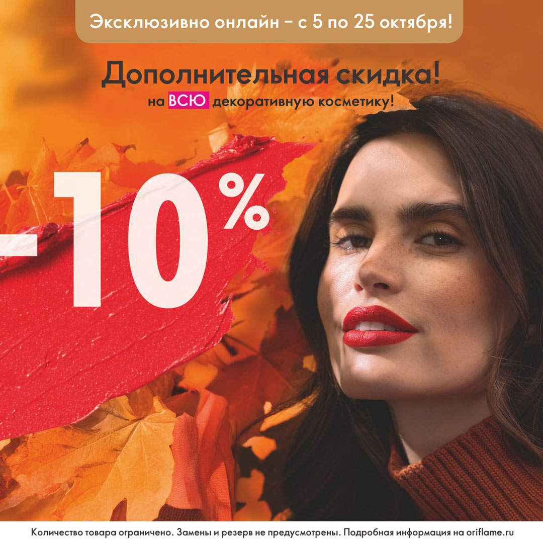 С 5 по 25 октября включительно действует дополнительная скидка 10% на всю коллекцию декоративной косметики Oriflame.