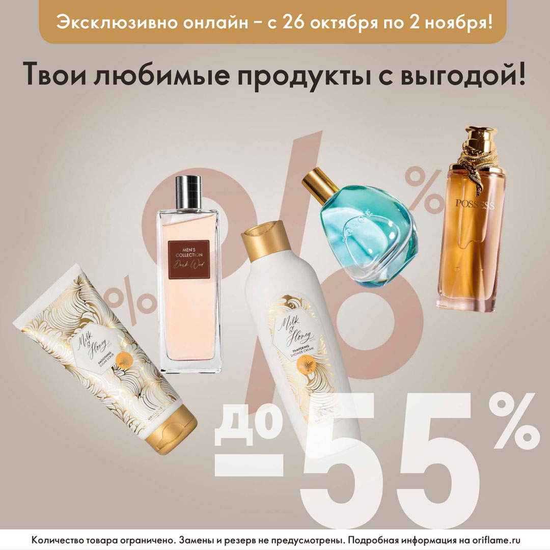 С 26 октября по 2 ноября включительно действуют скидки до 55% на избранные продукты: ароматы, декоративную косметику, средства по уходу за телом и волосами и многое другое.