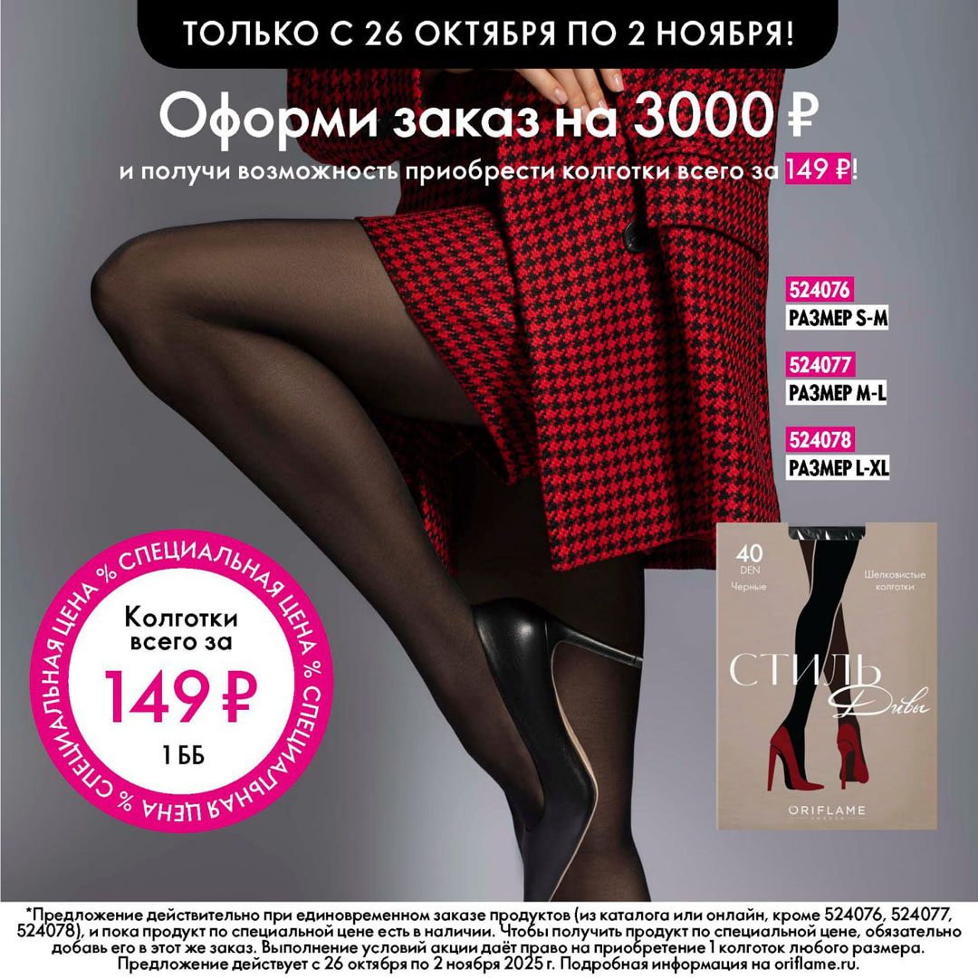 С 26 октября по 2 ноября включительно при единовременном заказе на 3000 рублей вы получаете возможность приобрести колготки в классическом чёрном цвете всего за 149 рублей.