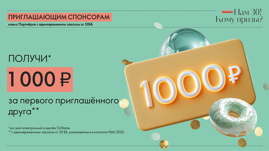 - Получите 1500 рублей3 на свой электронный кошелёк, которые могут быть использованы получением скидки на покупку продуктов Oriflame при совершении заказов, размещенных в период с 10 мая 2026 года с ограничением до 60% от общей суммы заказа.