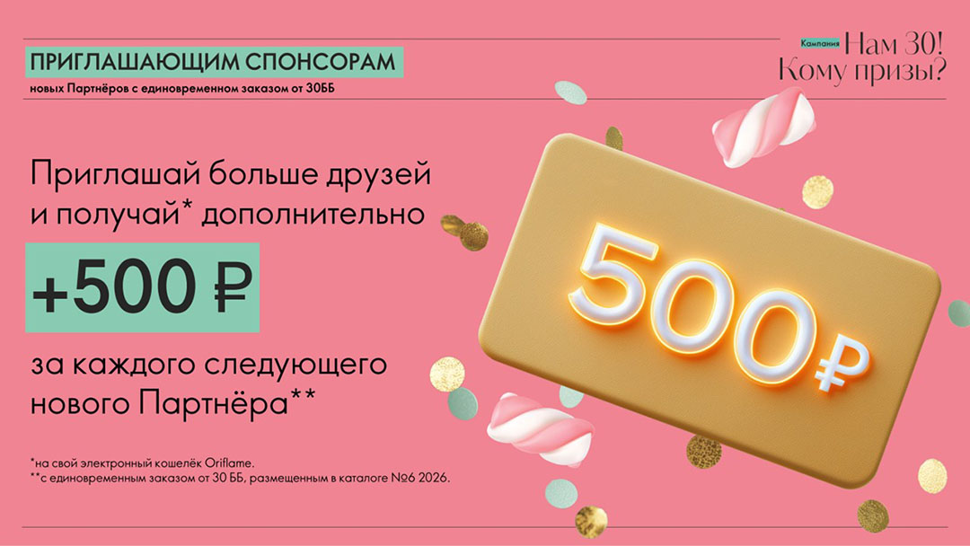 Кампания по приглашению «Нам 30! Кому призы?» действует с 19 апреля по 9 мая 2026 года. Денежные призы для новых партнёров и приглашающих спонсоров.