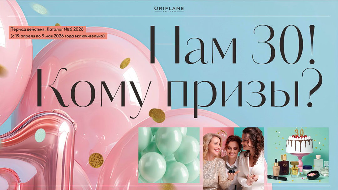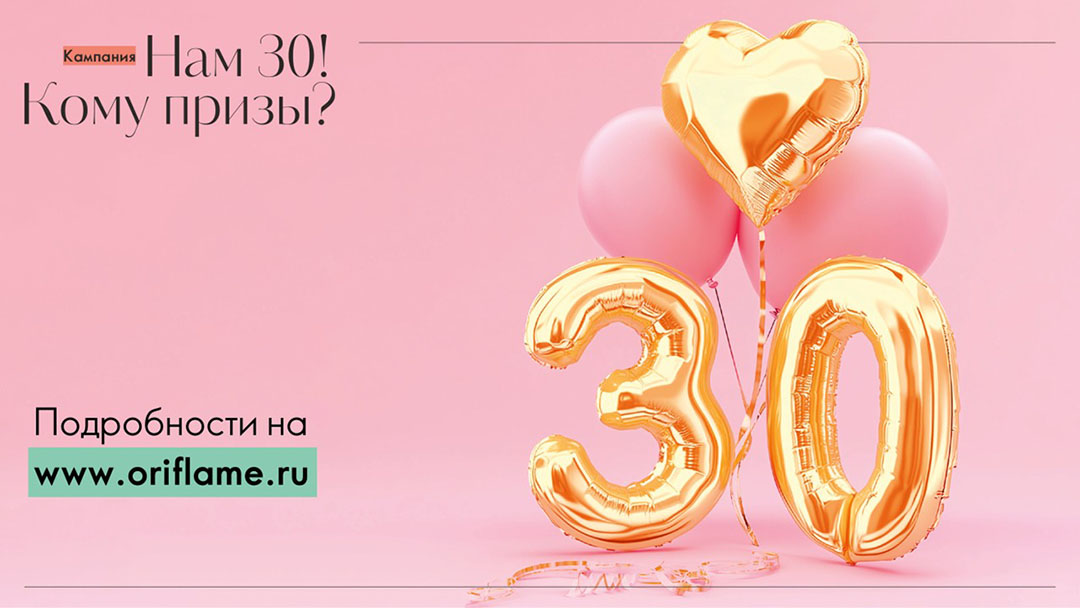 Кампания «Нам 30! Кому призы?» действует только на территории РФ. Подробная информация об организаторе кампании, о правилах и сроках ее проведения, продуктах, участвующих в кампании, сроках и порядке их получения указана на сайте www.oriflame.ru.