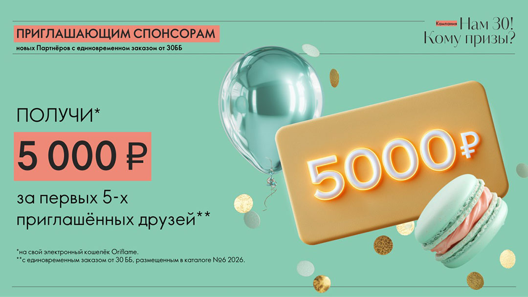 - Пригласите5 5-ых новых Партнёров с единовременным заказом от 30 ББ2 и получите6 5000 рублей;