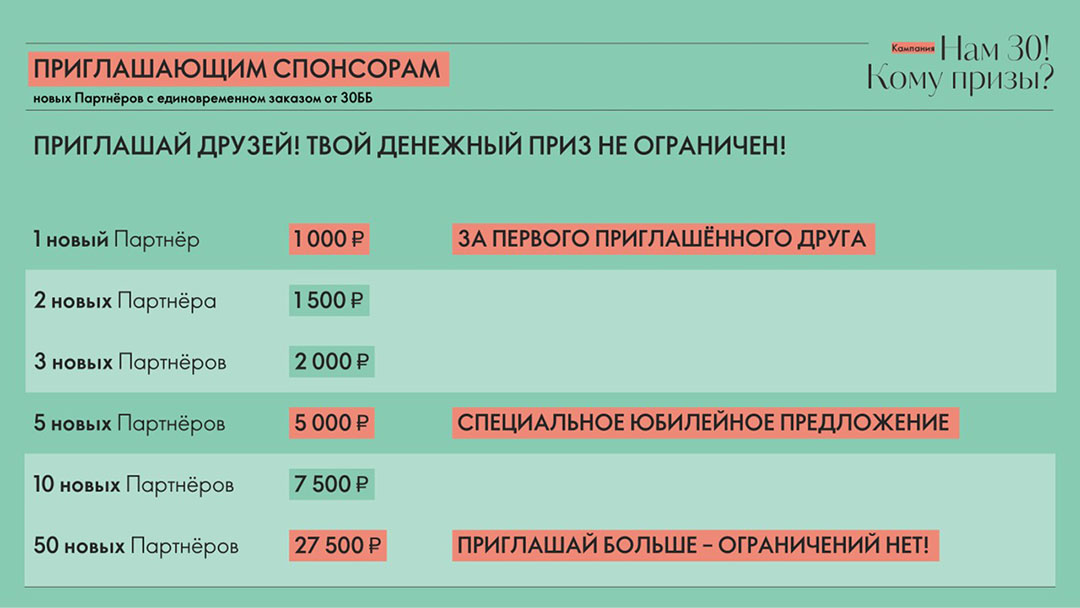 Если вы пригласите 4-х новых1 Партнёров, то получите приз 2500 рублей. Если пригласите 5-ых новых1 Партнёров, то ваш приз составит уже 5000 рублей. Пригласите 10 новых1 Партнёров — приз составит 7500 рублей, и так далее, по 500 рублей за каждого следующего нового1 Партнёра с единовременным заказом от 30 ББ2.