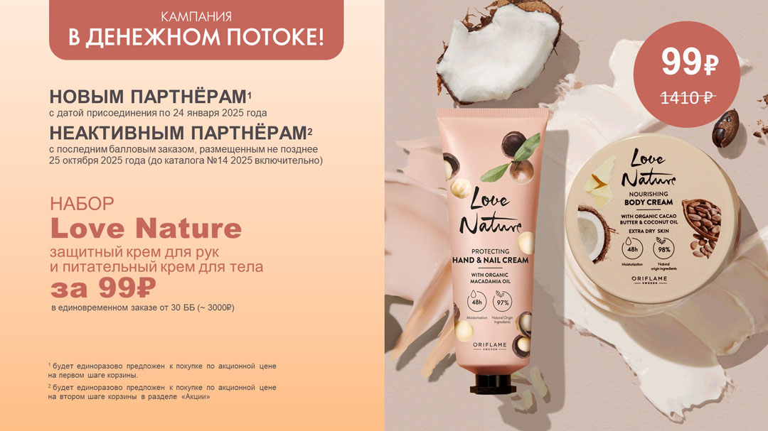 3 Акционный продукт — набор Love Nature (питательный крем для тела Love Nature (42991) и крем для рук и ногтей Love Nature (41335)) можно получить один раз в количестве 1 шт. Предложение о приобретении акционного продукта новым Партнёрам происходит единоразово в момент размещения первого по счёту единовременного заказа, достигшего 30 ББ или более в период действия кампании. Предложение о приобретении акционного продукта неактивным Партнёрам происходит на втором шаге Корзины заказа, достигшего 30 ББ или более в период действия кампании, в этом случае акционный продукт необходимо самостоятельно вложить в свой заказ. За акционный продукт взимается плата 99 рублей (ББ=1). Если заказ был полностью отменен в каталоге его размещения, то возможность приобретения акционного продукта снова будет доступной. От акционного продукта можно отказаться, удалив его из корзины, или не добавляя его в корзину. В случае, если акционный продукт закончится на складе, компания вправе предложить равноценную замену и продлить срок выдачи. Компания вправе досрочно прекратить Акцию в случае, если предложенные равноценные замены закончатся раньше заявленного срока её окончания.