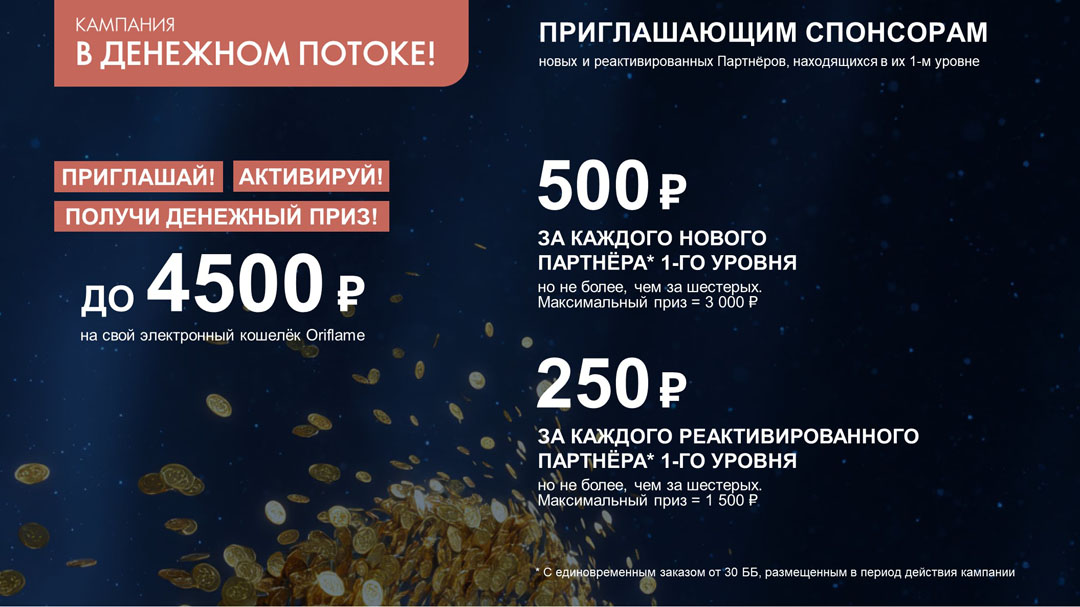 Кампания «В ДЕНЕЖНОМ ПОТОКЕ!» действует только на территории РФ. Подробная информация об организаторе кампании, о правилах и сроках ее проведения, продуктах, участвующих в кампании, сроках и порядке их получения указана на сайте www.oriflame.ru.8 Начисление дополнительной выплаты осуществляется в каталоге, следующем за каталогом, в котором были выполнены вышеупомянутые условия вместе с вознаграждением, предусмотренным Планом Вознаграждения Oriflame, и начисленным Партнёру по итогам указанного в условиях периоде. Выплата производится на расчетный счет предпринимателя (ИП) или самозанятого (СЗ). Необходимым условием для начисления вознаграждения является наличие статуса индивидуального предпринимателя (ИП) или самозанятого (СЗ) и заключенного договора возмездного оказания услуг (ДВОУ) с ООО «Орифлэйм Косметикс» в указанных выше статусах. Дополнительная выплата не начисляется, если Партнёр не заключает договор возмездного оказания услуг в течение 17 каталожных периодов, следующих за каталогом выполнения квалификации, или если её размер менее 1000 рублей.