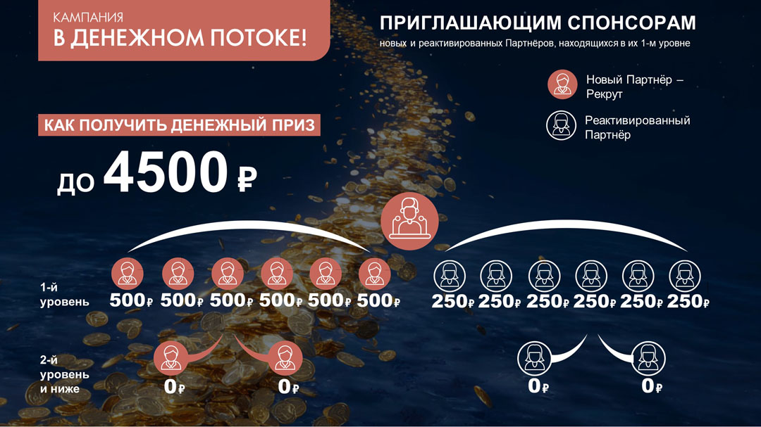 - 500 рублей за каждых 2-х реактивированных Партнёров9 свыше 6-ти, приглашенных вами в свою Персональную Группу10.