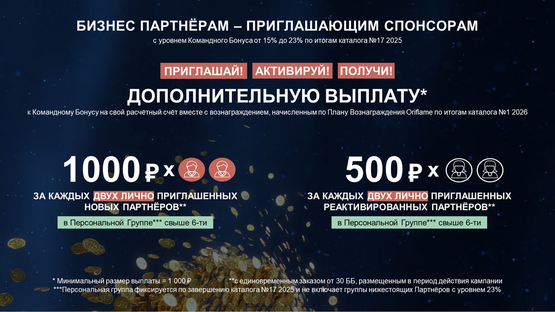 - Получите дополнительную выплату8 к вашему Командному Бонусу за лично приглашенных рекрутов9 и лично приглашенных реактивированных Партнёров9, находящихся в вашей Персональной Группе10 и разместивших единовременный заказ от 30 ББ в период действия каталога №1 2026: