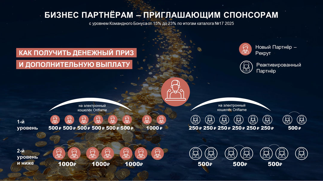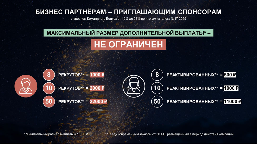 - Получите дополнительную выплату8 к вашему Командному Бонусу за лично приглашенных рекрутов9 и лично приглашенных реактивированных Партнёров9, находящихся в вашей Персональной Группе10 и разместивших единовременный заказ от 30 ББ в период действия каталога №1 2026: