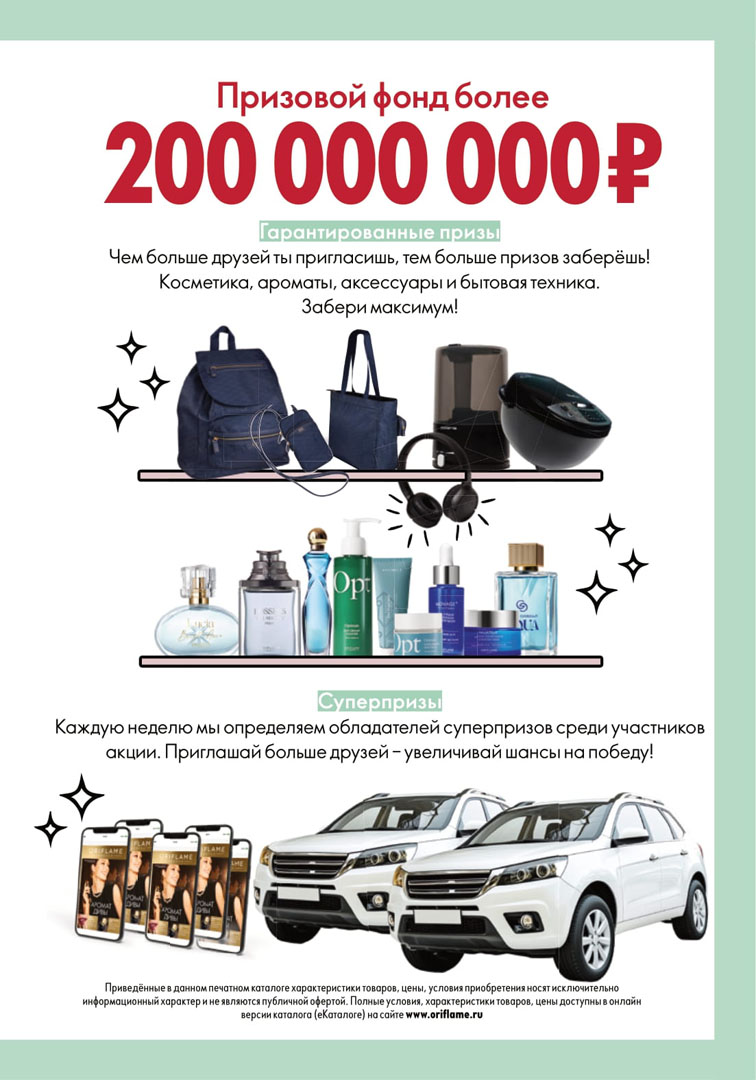 Участвуя в акциях для партнёров и распродажах, можно получать дополнительные бонусы и покупать продукцию с ещё большими скидками. Всю информацию о специальных программах и акциях, действующих в этом каталожном периоде, можно найти в разделе «Акции» с началом действия каталога.