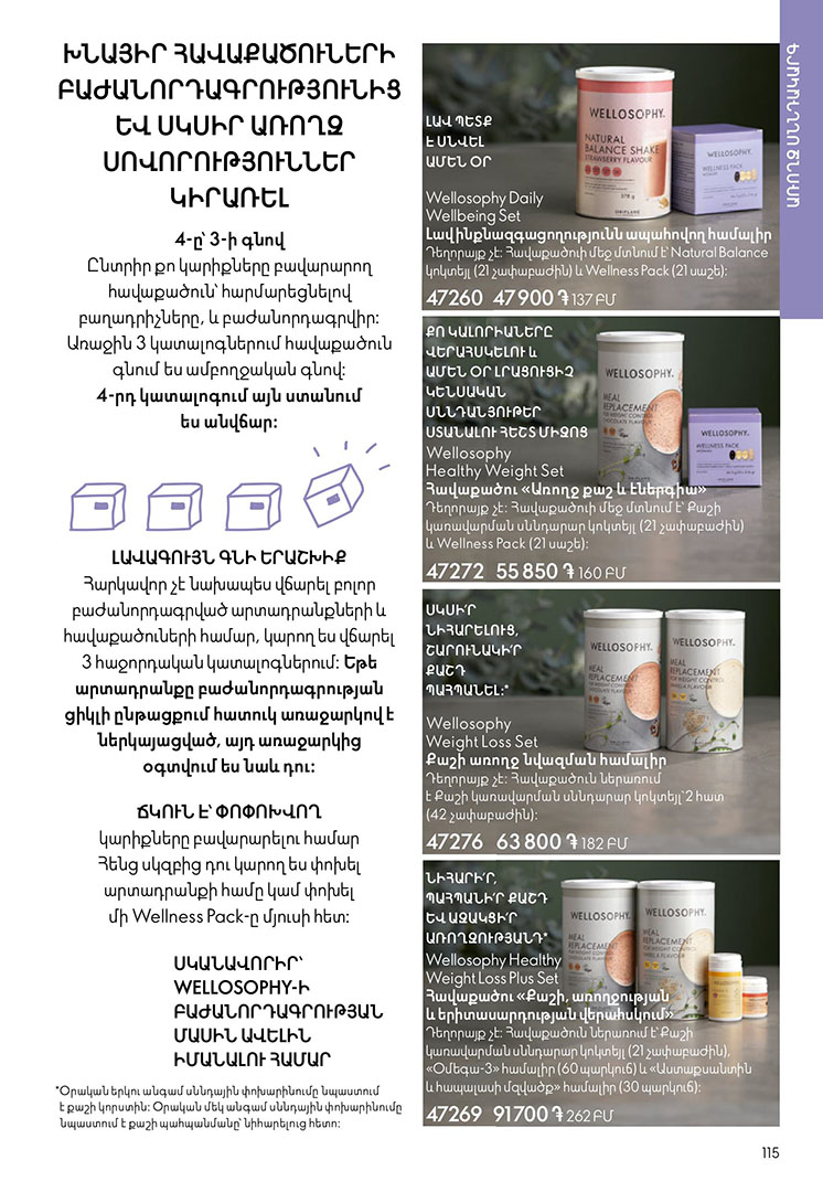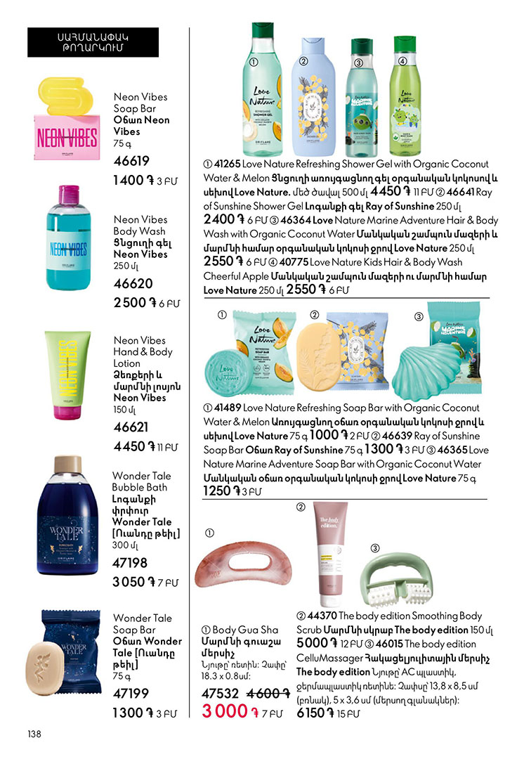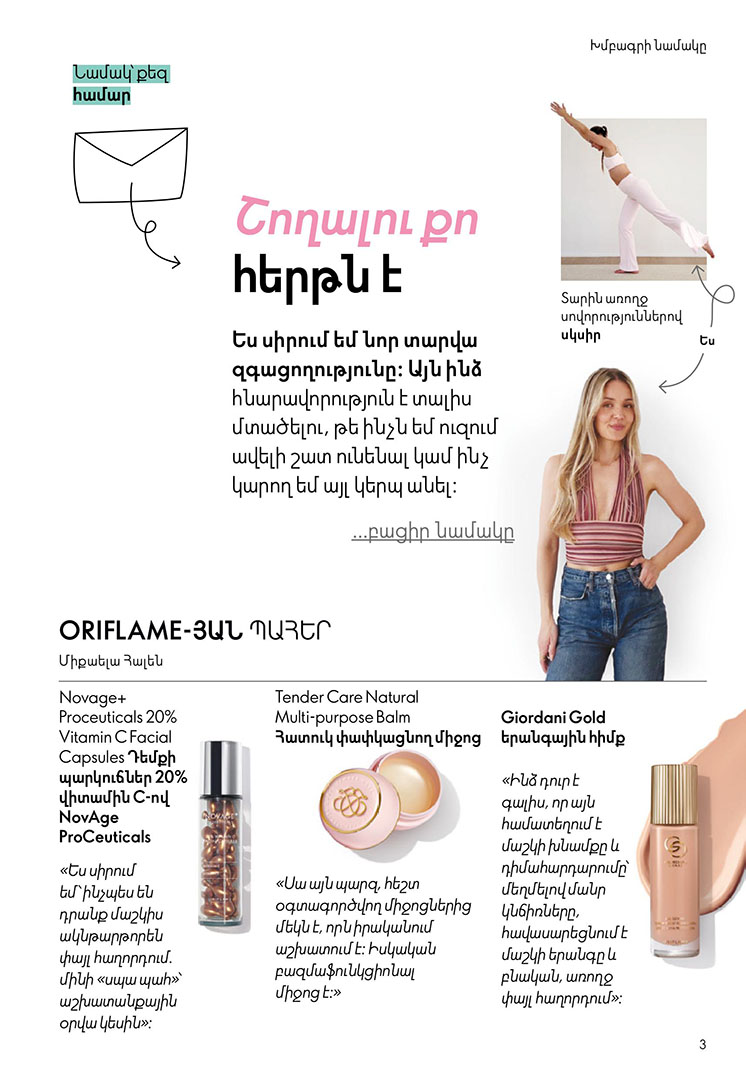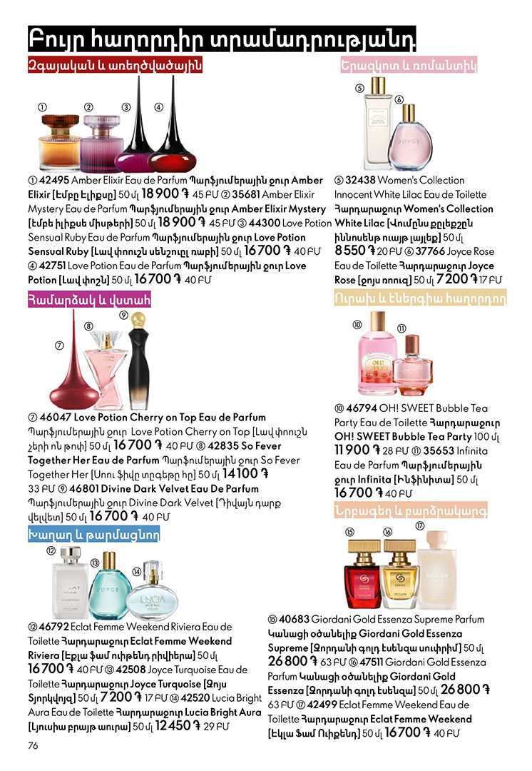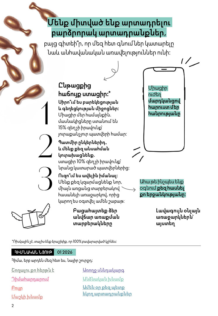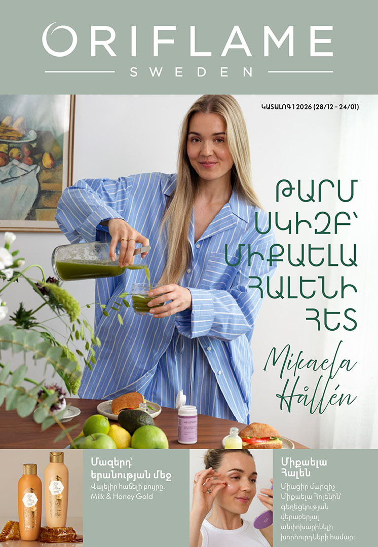 На этой странице можно посмотреть следующий каталог Орифлейм Армения с ценами в армянских драмах без регистрации на сайте. Заказ можно сделать самостоятельно на официальном сайте в личном кабинете. Если зарегистрироваться как консультант, то будет действовать скидка 20% на всю продукцию от цен в каталоге.