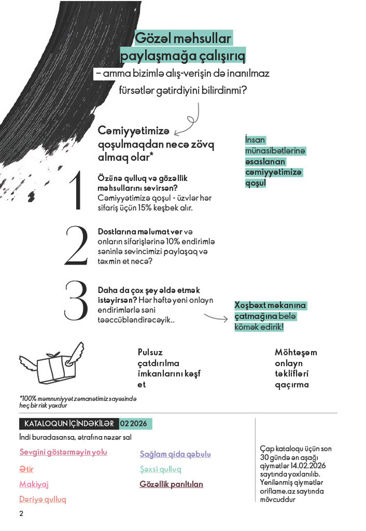 Каталог Орифлейм 2 2026 года для Азербайджана с ценами в азербайджанских манатах. Предложение действует с 25 января по 14 февраля 2026 года.