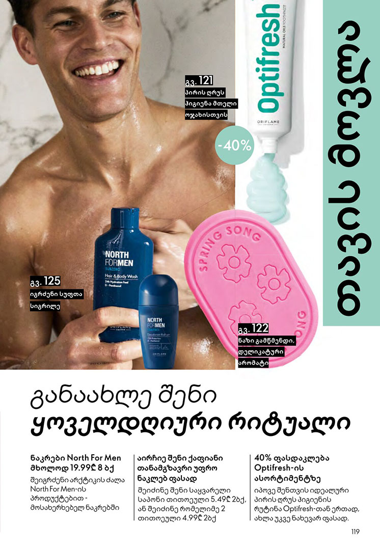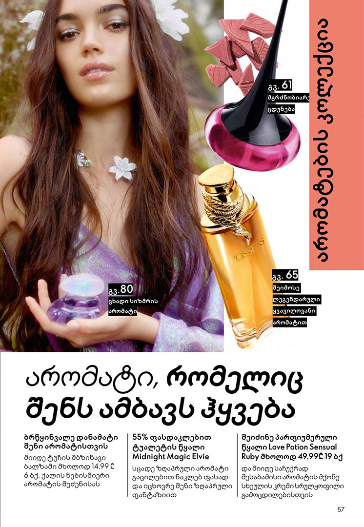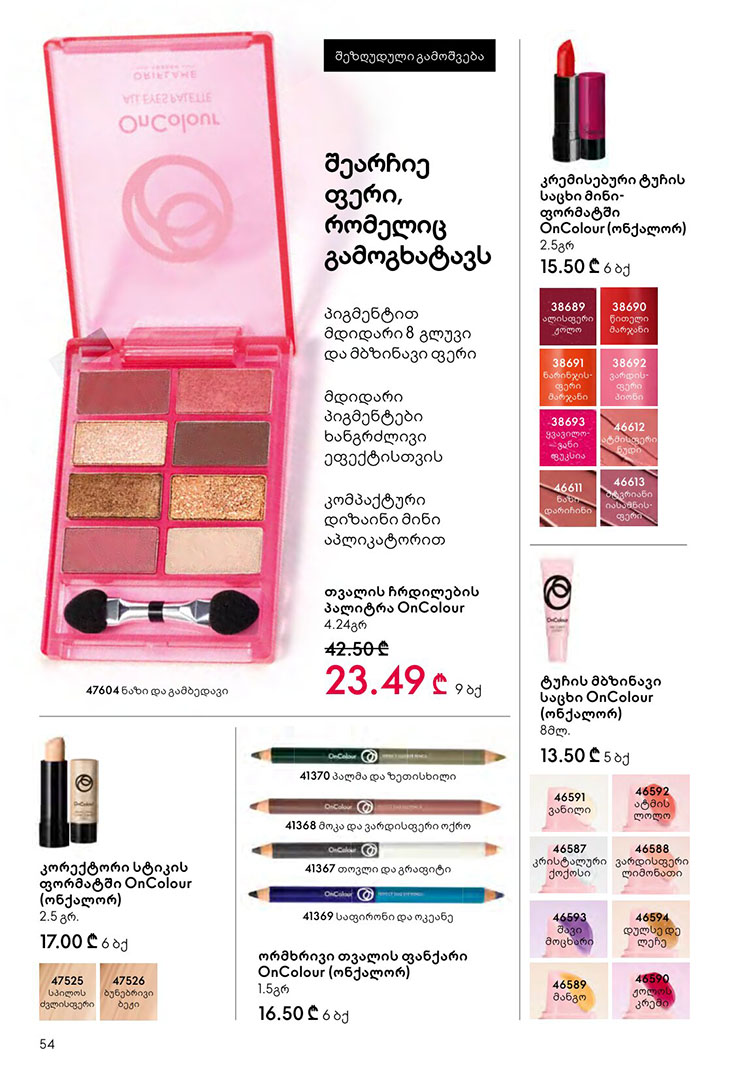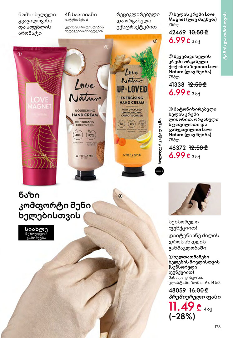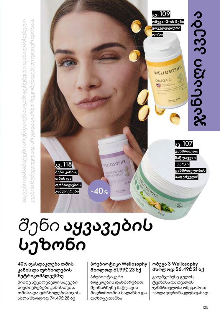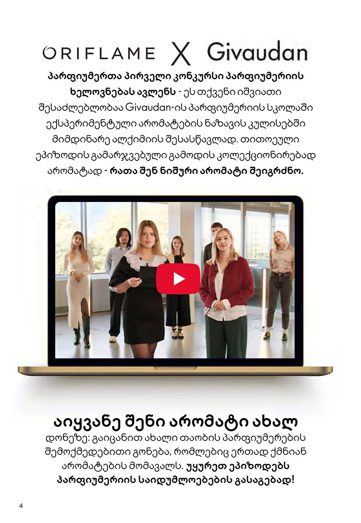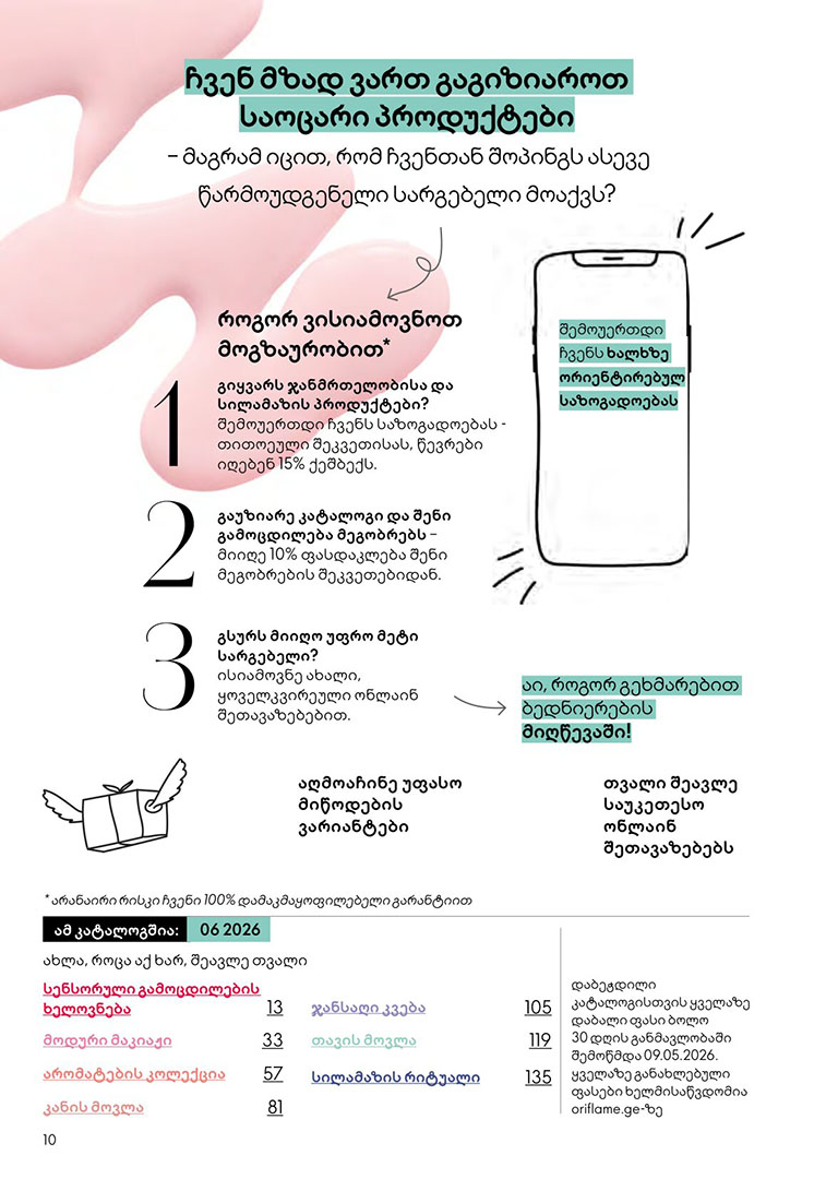 На этой странице можно посмотреть следующий каталог Орифлейм Грузия с ценами в грузинских лари без регистрации на сайте. Заказ можно сделать самостоятельно на официальном сайте в личном кабинете. Если зарегистрироваться как консультант, то будет действовать скидка 20% на всю продукцию от цен в каталоге.