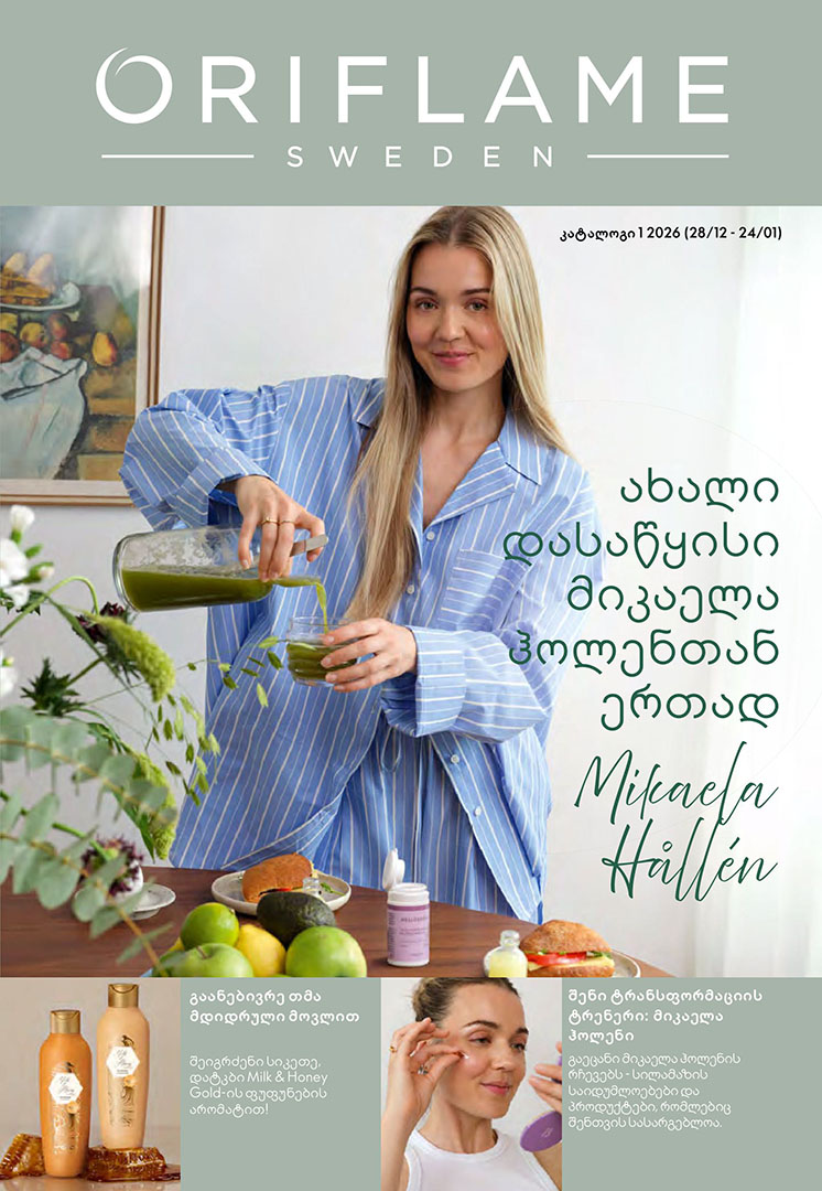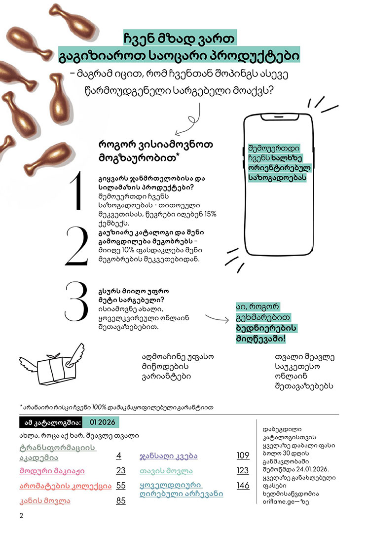 Каталог Орифлейм 1 2026 года для Грузии с ценами в грузинских лари. Предложение действует с 28 декабря 2025 по 24 января 2026 года.