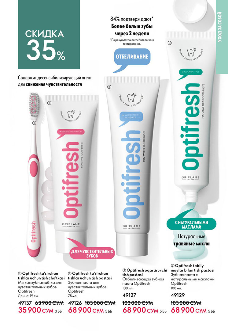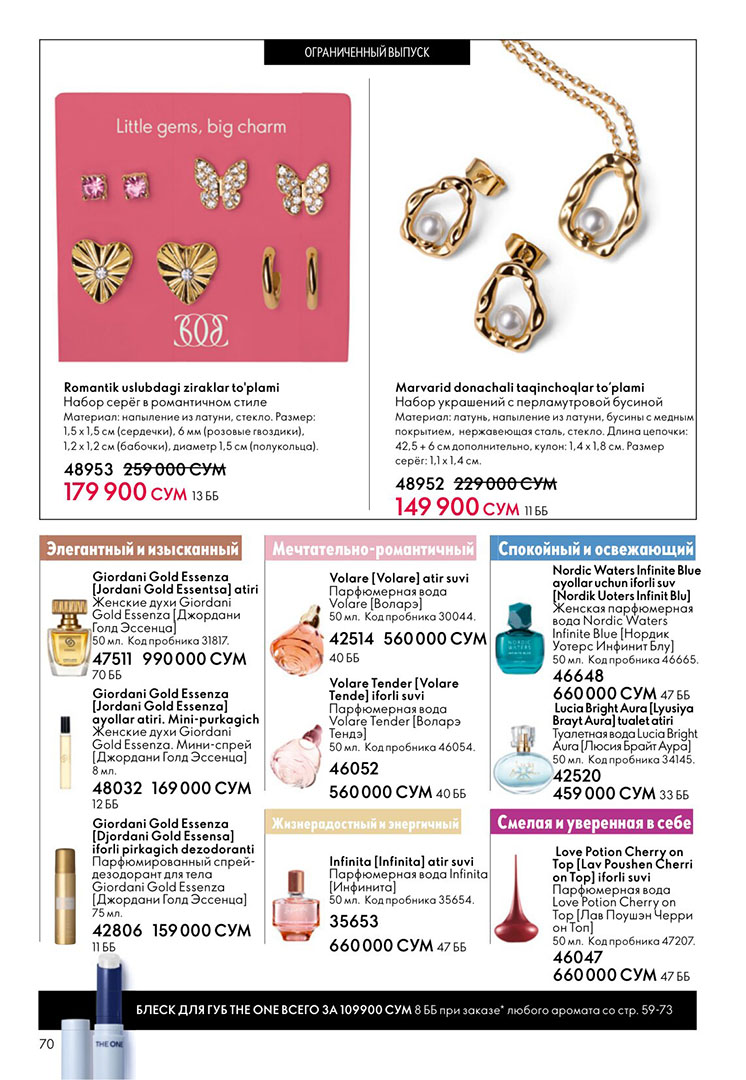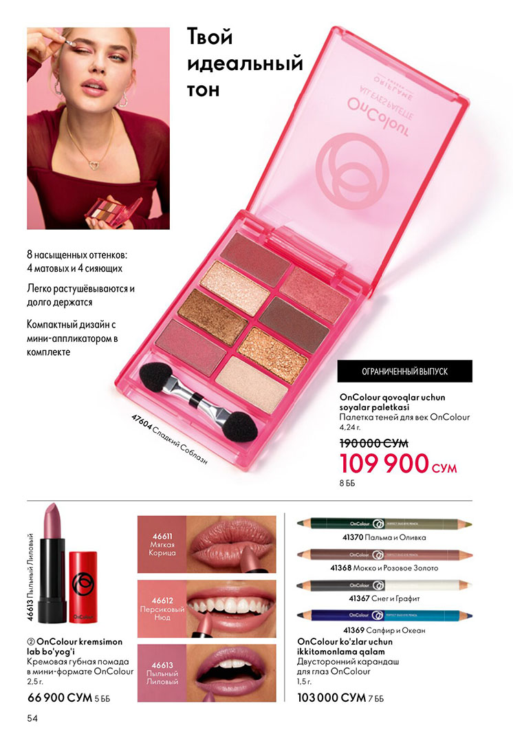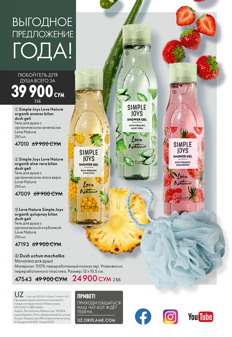 На этой странице можно посмотреть следующий каталог Орифлейм Узбекистан с ценами в сумах без регистрации. Заказ можно сделать самостоятельно на официальном сайте в личном кабинете. Если зарегистрироваться как консультант, то будет действовать скидка 20% на всю продукцию Орифлэйм от цен в каталоге.