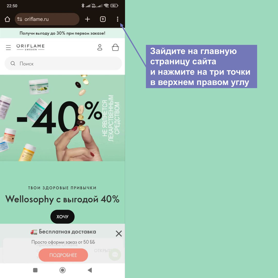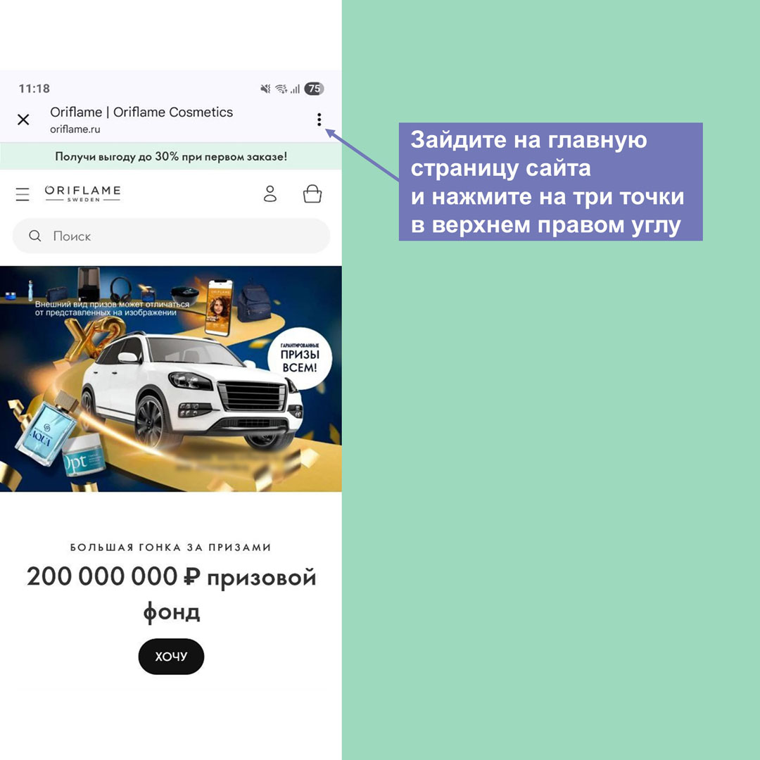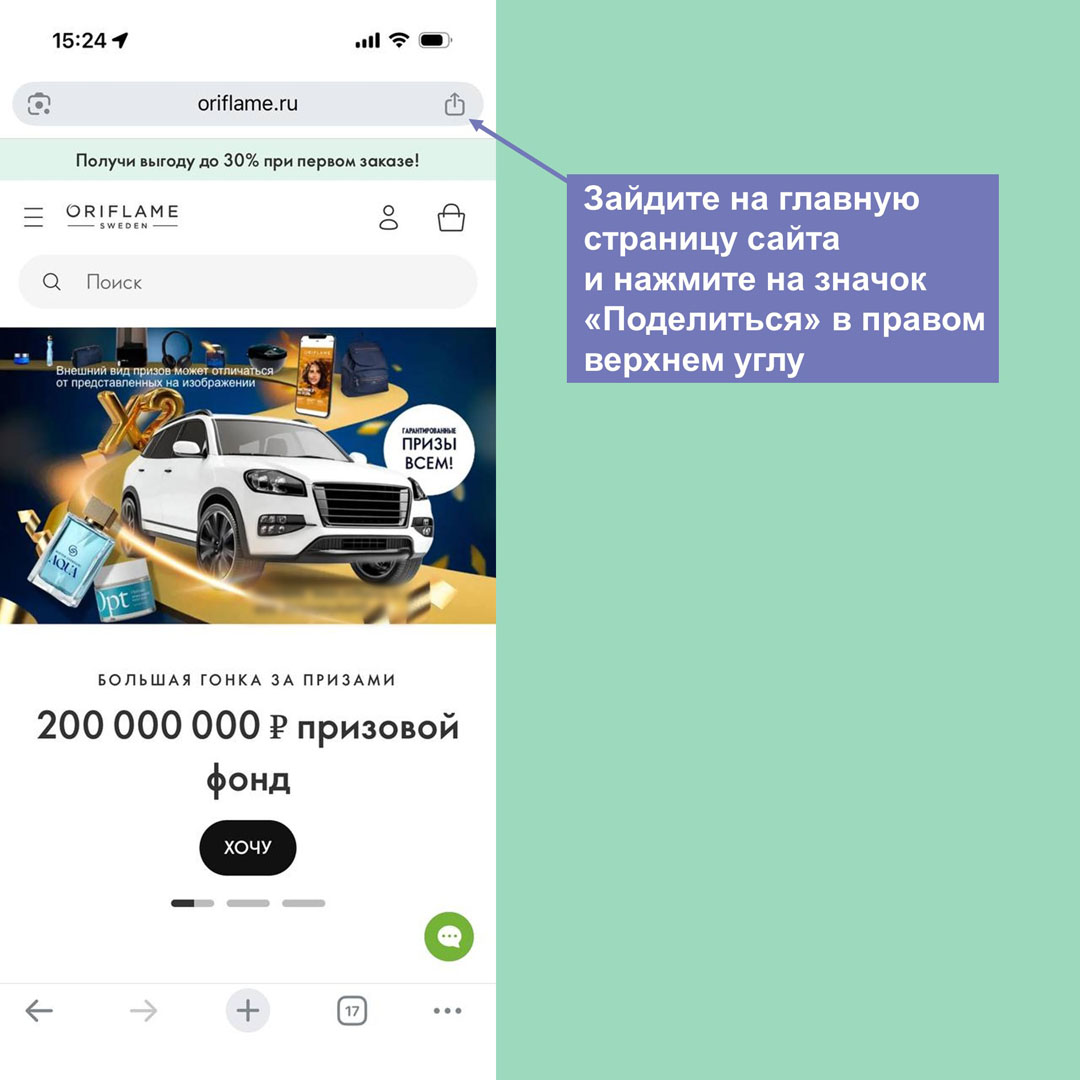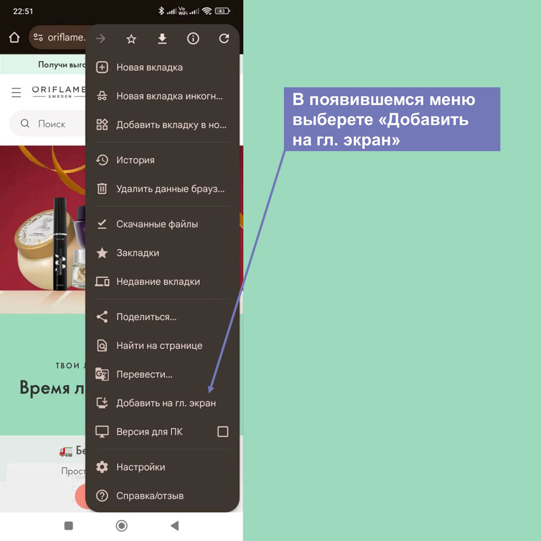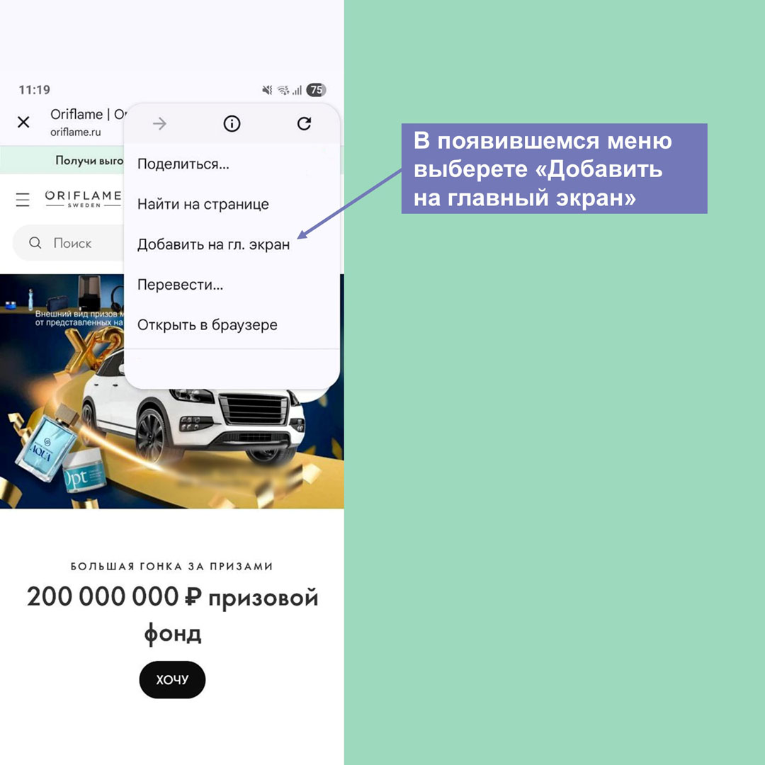 Чтобы сделать доступ к сайту oriflame.ru проще и быстрее, установите его ярлык на смартфон. Пошаговая инструкция в картинках по установке на Android и IOS доступна ниже. Листается стрелками ◀ ▶.