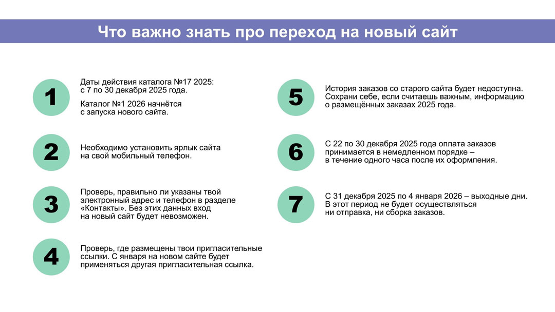 В связи с переходом на новый сайт с 22 декабря 2025 года в 00:01 часов по московскому времени услуга «Оплата перед получением» станет недоступна при оформлении заказов на любые сервисы доставки через сайт или мобильное приложение Oriflame.
