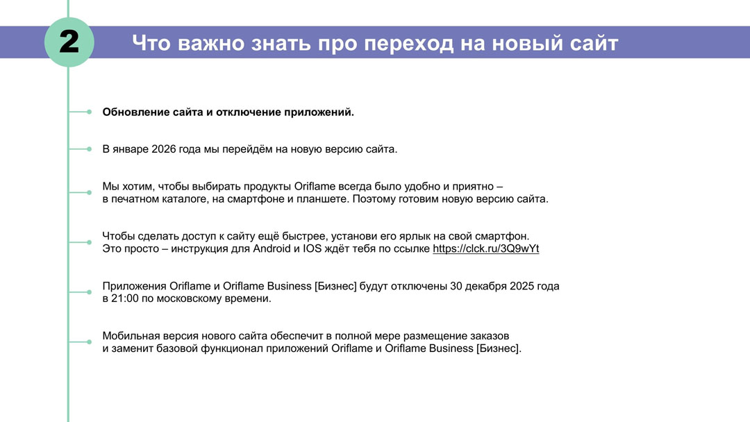 Ключевая информация о периоде обновления сайта, работе нового сайта и прекращению работе приложений Oriflame. Информация будет обновляться, сохраните страницу.