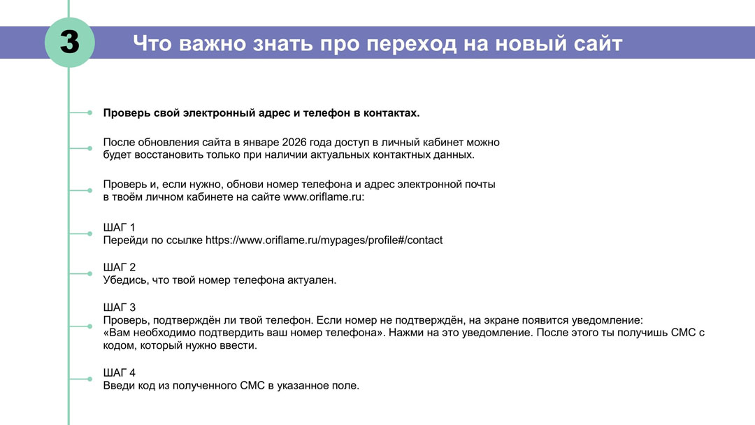 После обновления сайта в январе 2026 года доступ в личный кабинет можно будет восстановить только при наличии актуальных контактных данных. Проверьте и, если нужно, обновите номер телефона и адрес электронной почты в личном кабинете на сайте www.oriflame.ru: