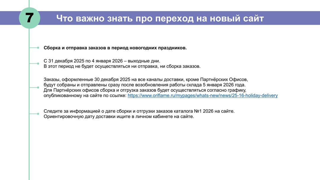Заказы, оформленные 30 декабря 2025 на все каналы доставки, кроме Партнёрских Офисов, будут собраны и отправлены сразу после возобновления работы склада 5 января 2026 года. Для Партнёрских офисов сборка и отгрузка заказов будет осуществляться согласно графику, опубликованному на сайте по ссылке: https://www.oriflame.ru/mypages/whats-new/news/25-16-holiday-delivery.