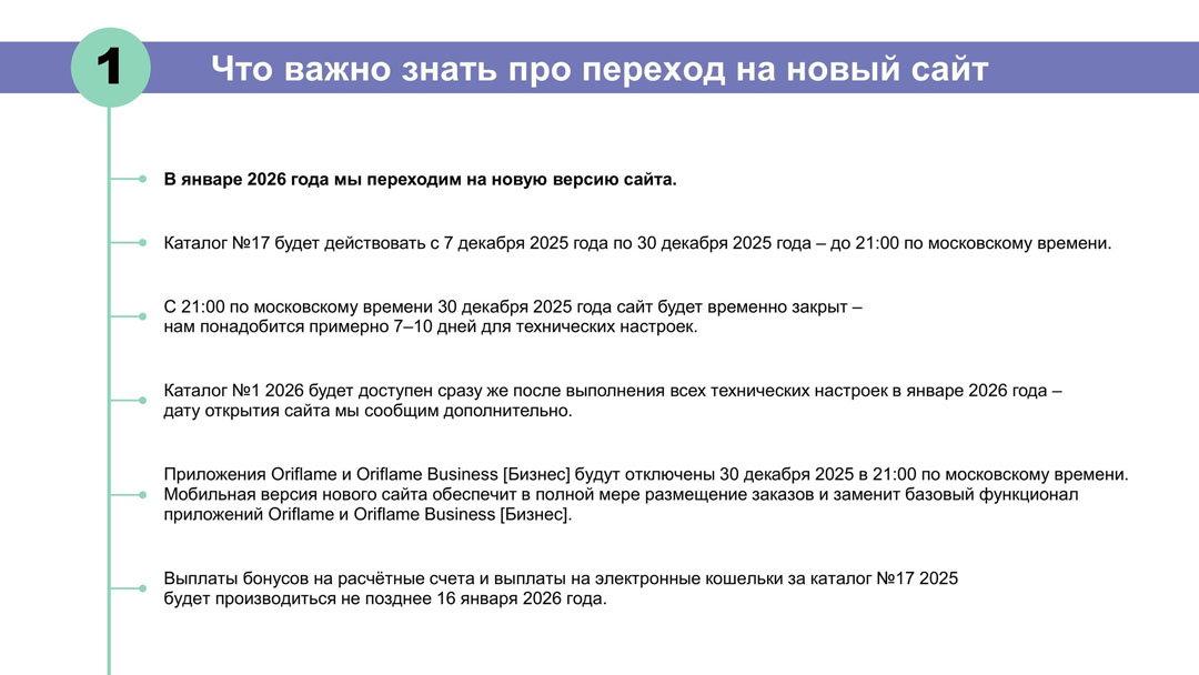 Ключевая информация о периоде обновления сайта, работе нового сайта и прекращению работе приложений Oriflame. Информация будет обновляться, сохраните страницу.