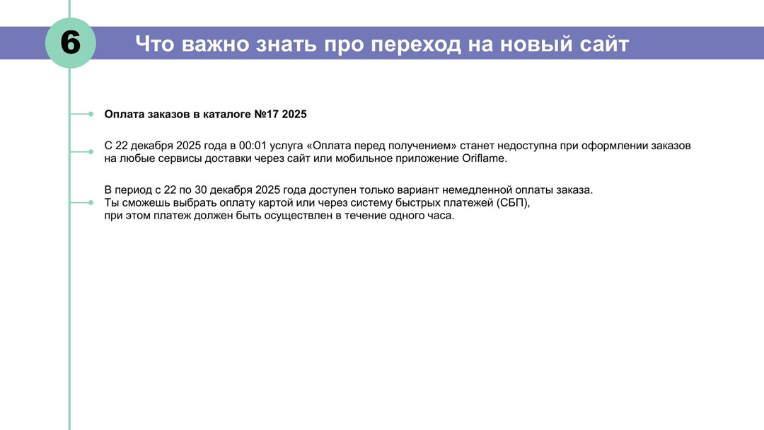 В связи с переходом на новый сайт с 22 декабря 2025 года в 00:01 часов по московскому времени услуга «Оплата перед получением» станет недоступна при оформлении заказов на любые сервисы доставки через сайт или мобильное приложение Oriflame.