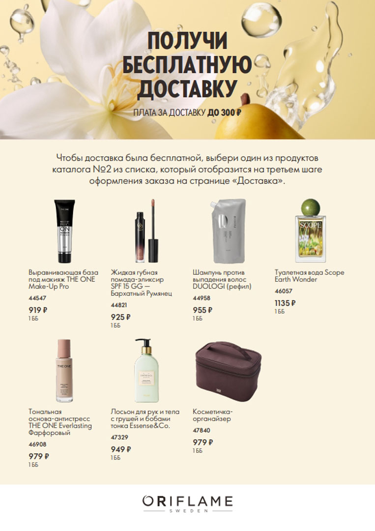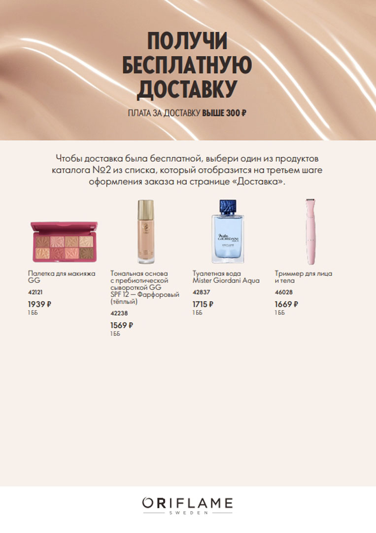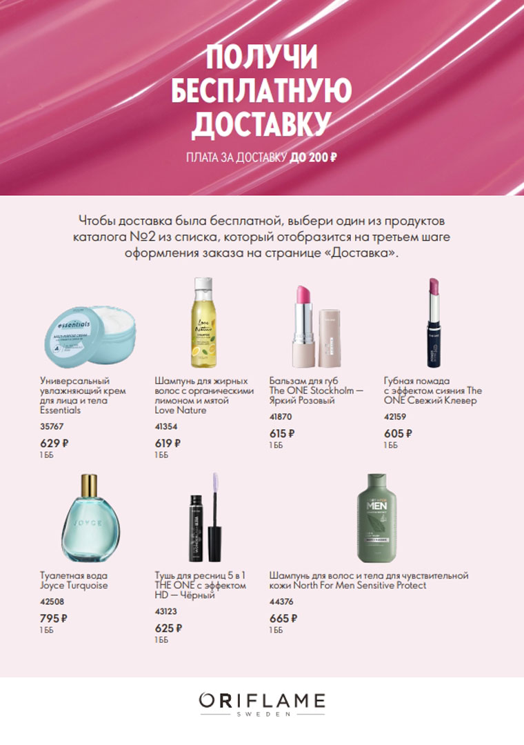Чтобы не платить за доставку, добавьте в заказ один из продуктов, который соответствует вашей зоне доставки. Предложение действует в каталоге Орифлэйм 2 2026, с 26 января по 14 февраля 2026 года.