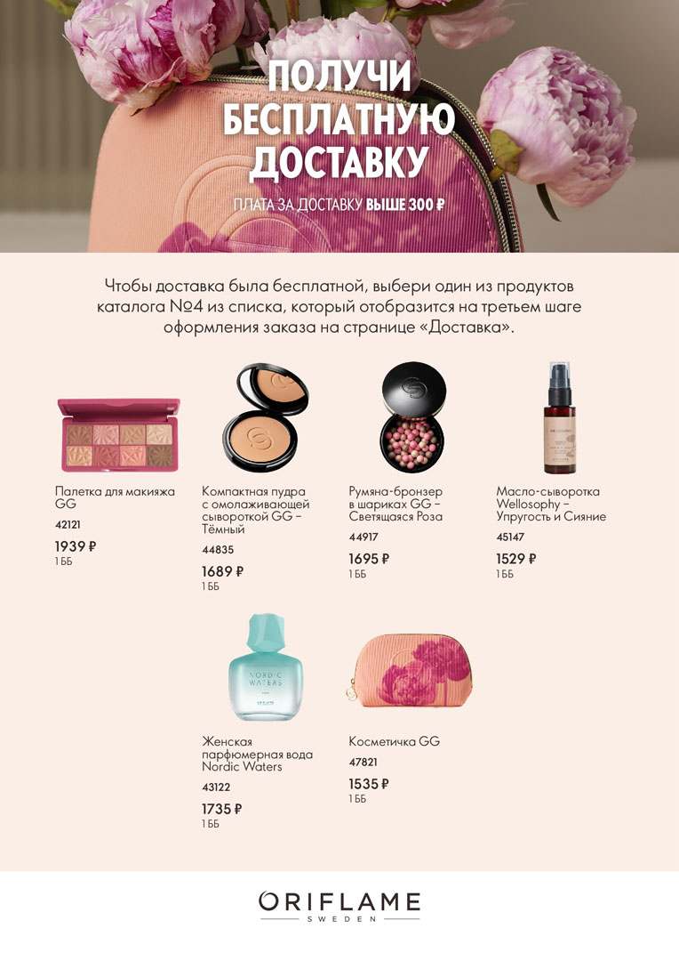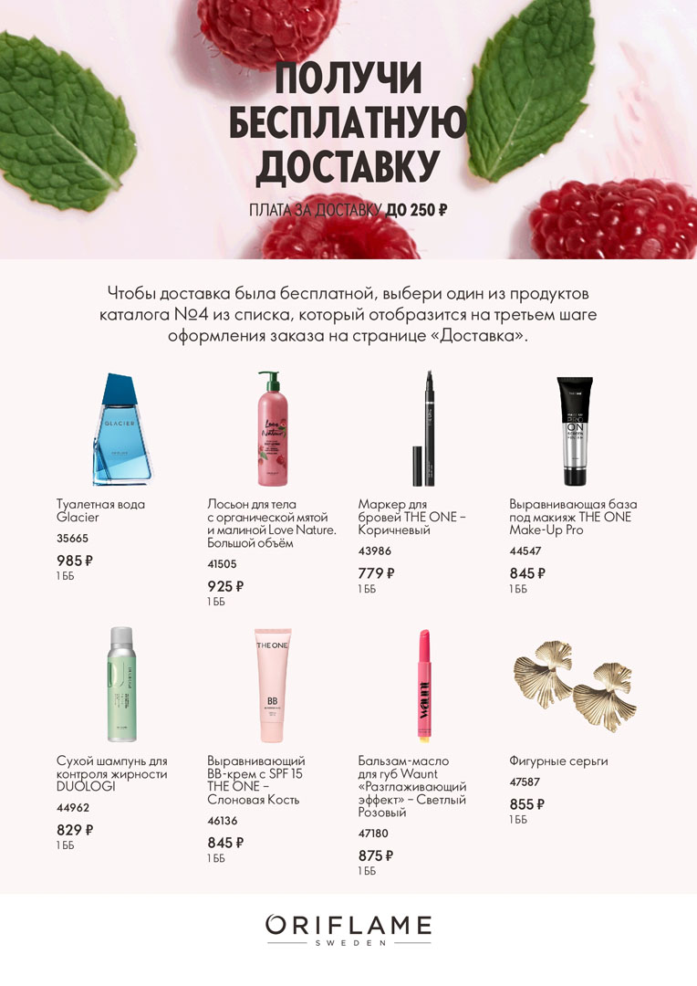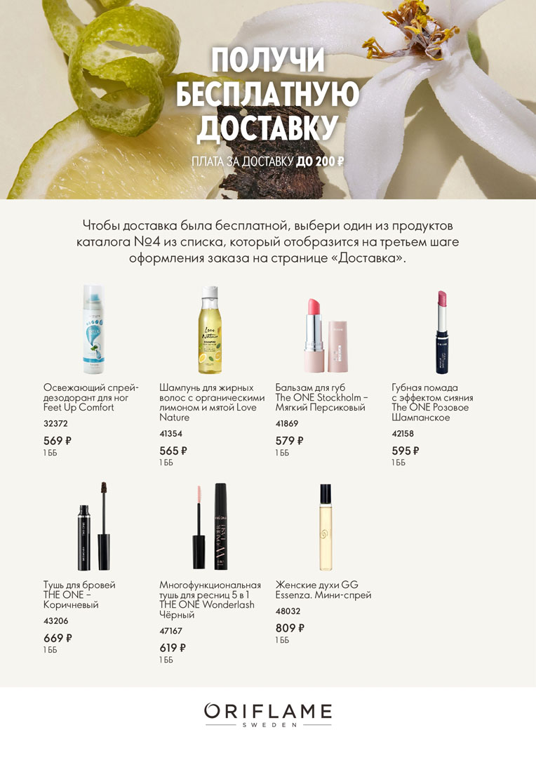 Чтобы не платить за доставку, добавьте в заказ один из продуктов, который соответствует вашей зоне доставки. Предложение действует в каталоге Орифлэйм 4 2026, с 8 по 28 марта 2026 года.