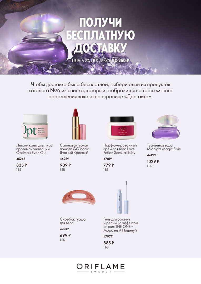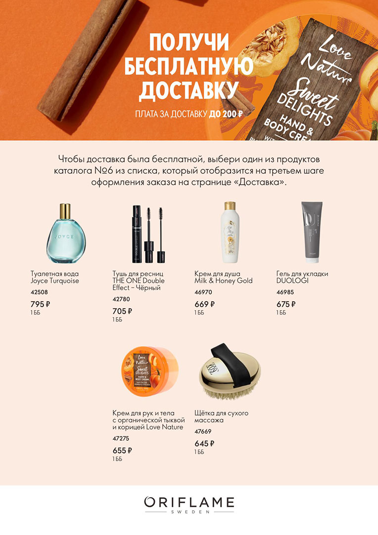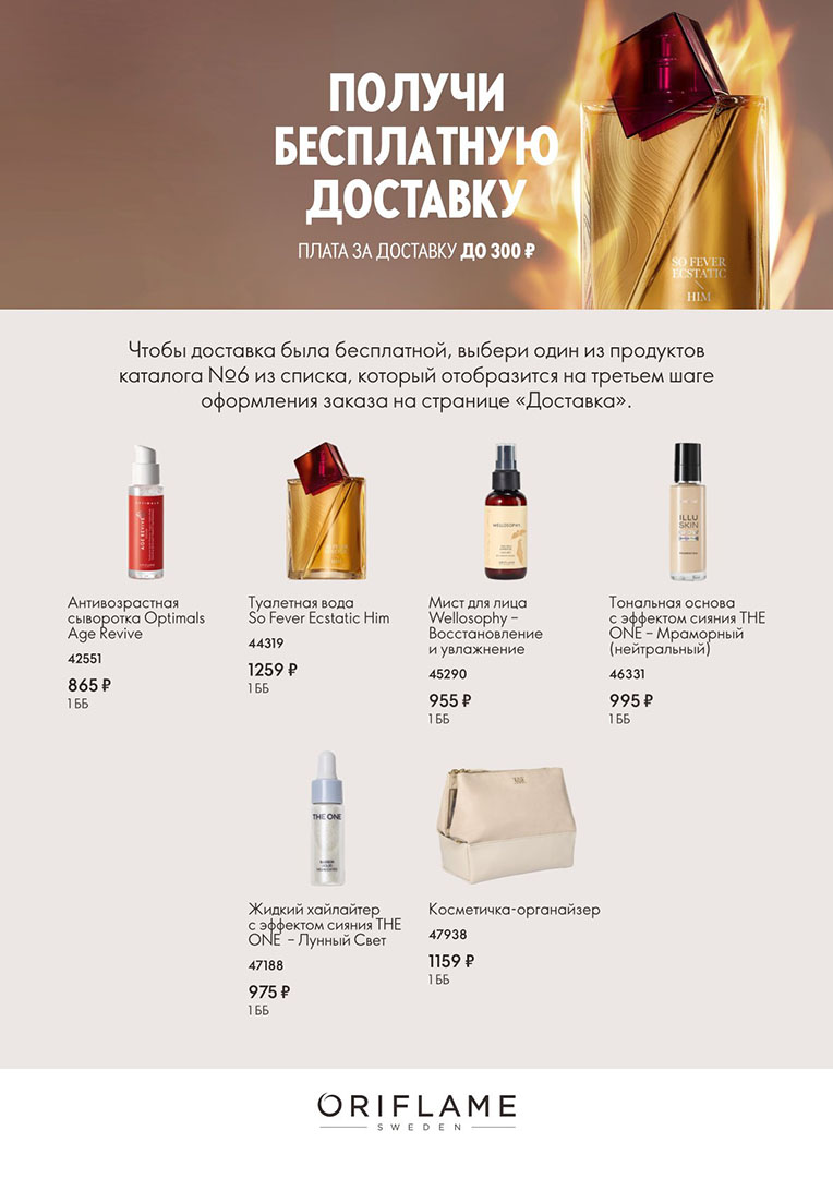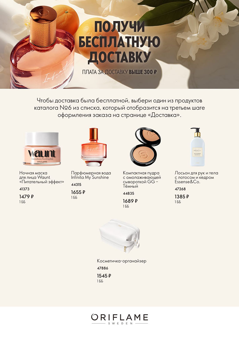 Чтобы не платить за доставку, добавьте в заказ один из продуктов, который соответствует вашей зоне доставки. Предложение действует в каталоге Орифлэйм 6 2026, с 19 апреля по 9 мая 2026 года.
