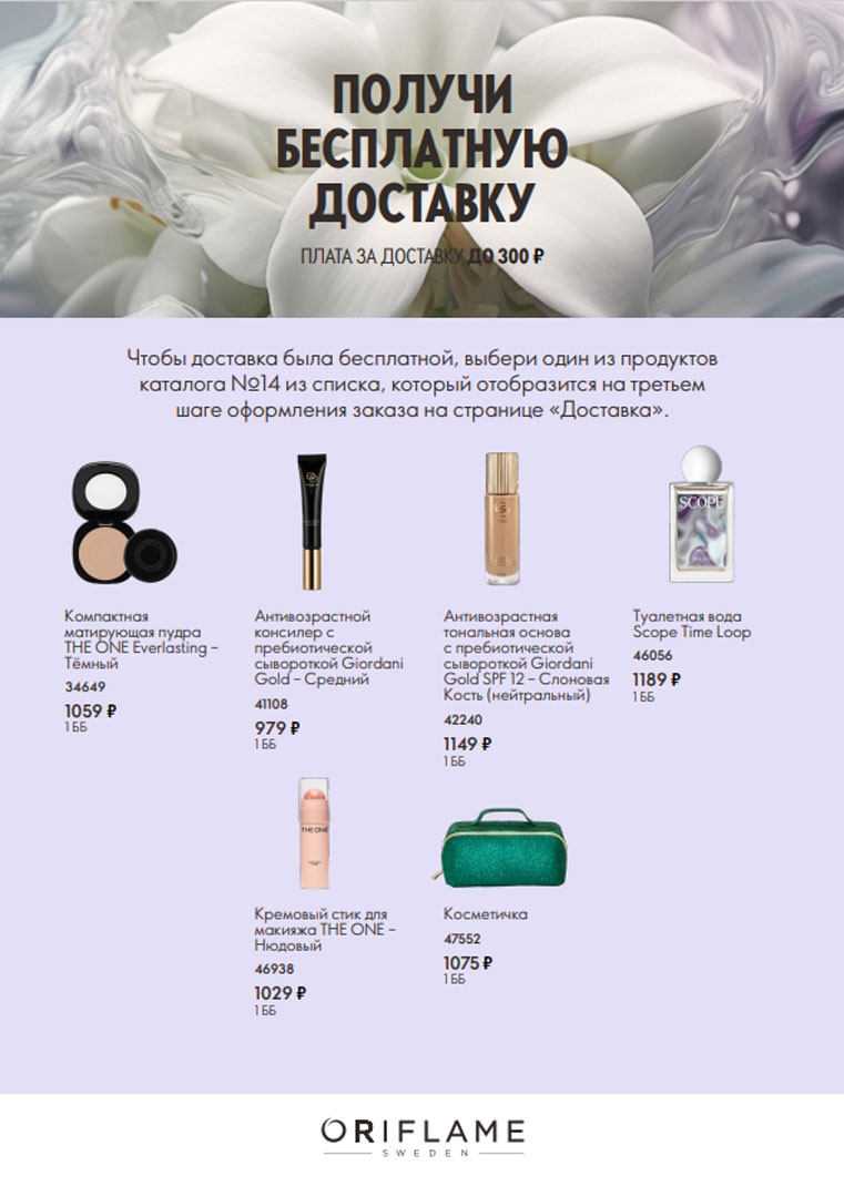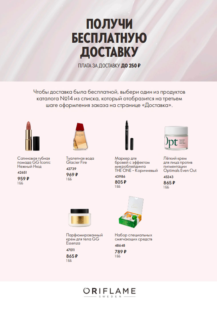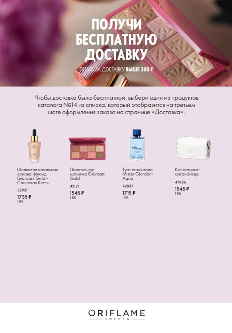 Чтобы не платить за доставку, добавьте в заказ один из продуктов, который соответствует вашей зоне доставки. Предложение действует в каталоге Орифлэйм 14 2025, с 5 по 25 октября 2025 года.