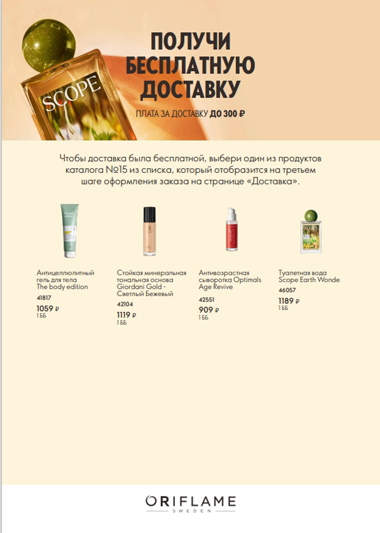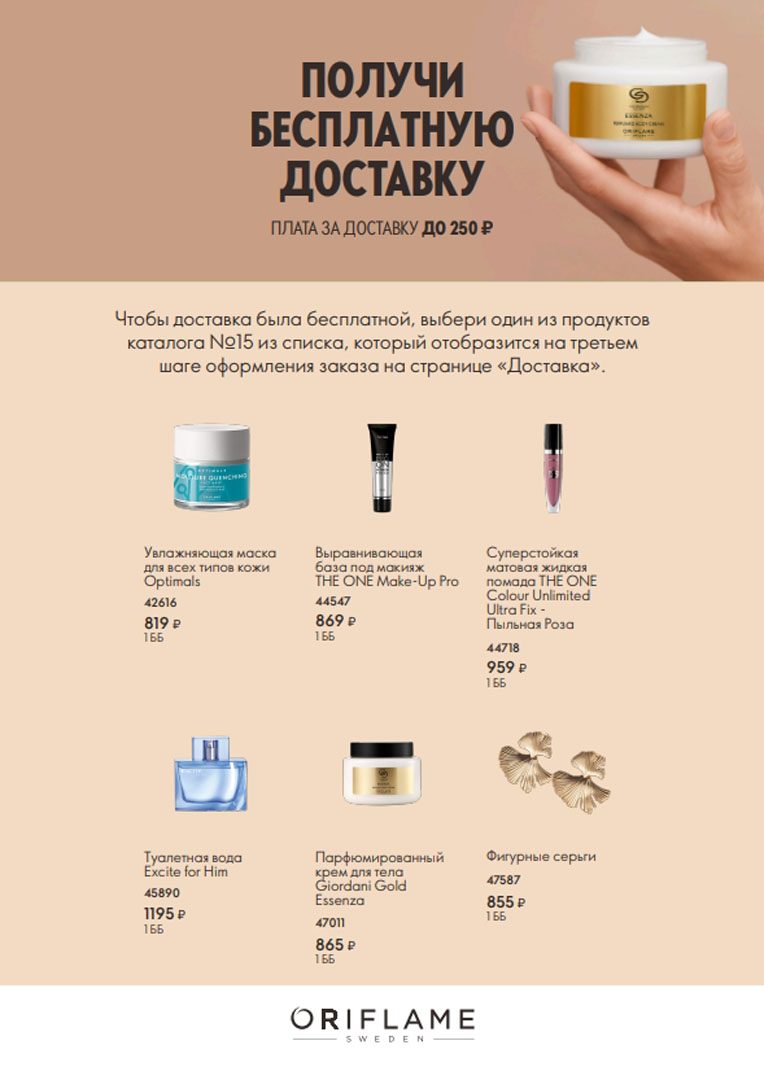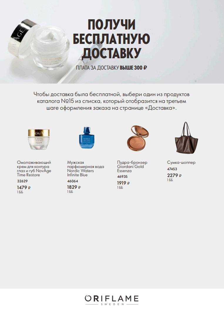 Чтобы не платить за доставку, добавьте в заказ один из продуктов, который соответствует вашей зоне доставки. Предложение действует в каталоге Орифлэйм 15 2025, с 26 октября по 15 ноября 2025 года.