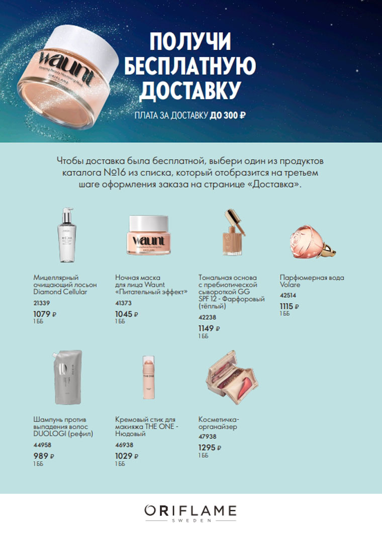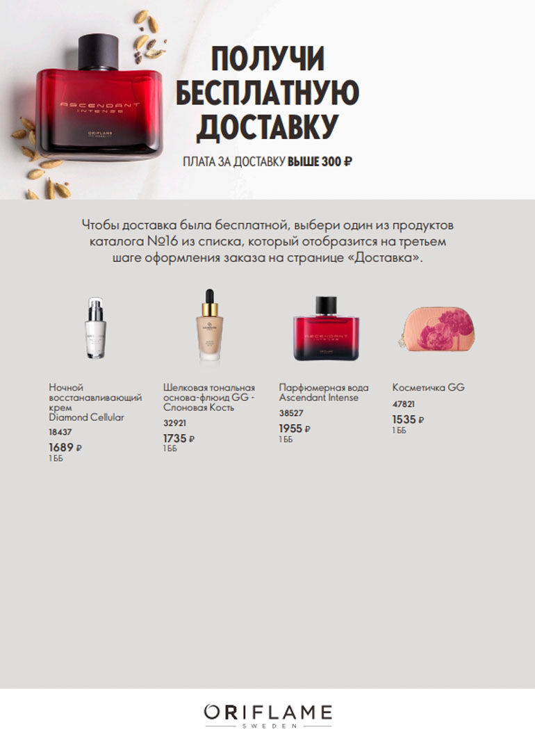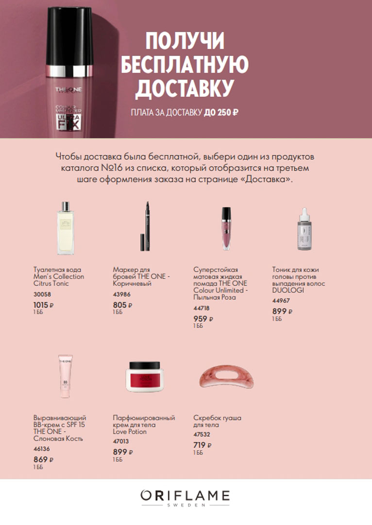 Чтобы не платить за доставку, добавьте в заказ один из продуктов, который соответствует вашей зоне доставки. Предложение действует в каталоге Орифлэйм 16 2025, с 16 ноября по 6 декабря 2025 года.