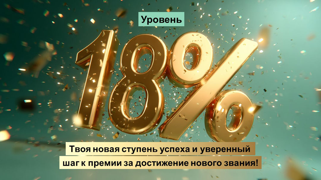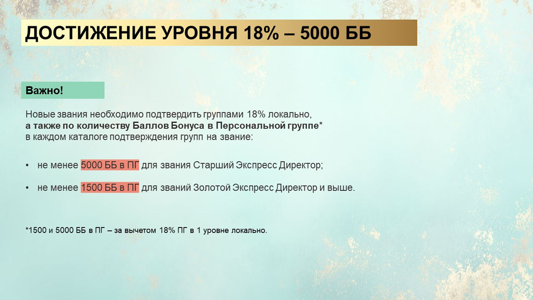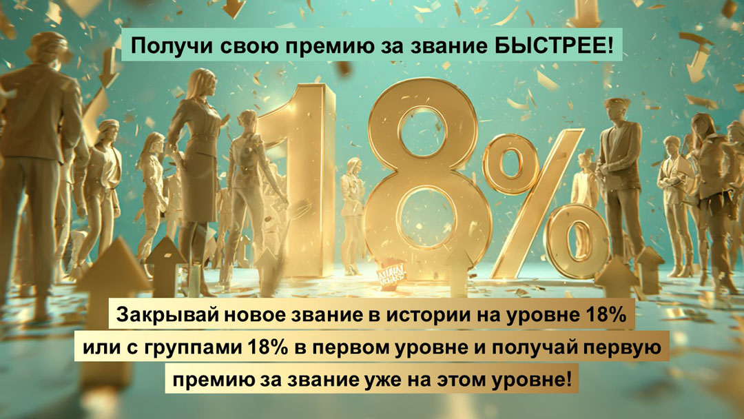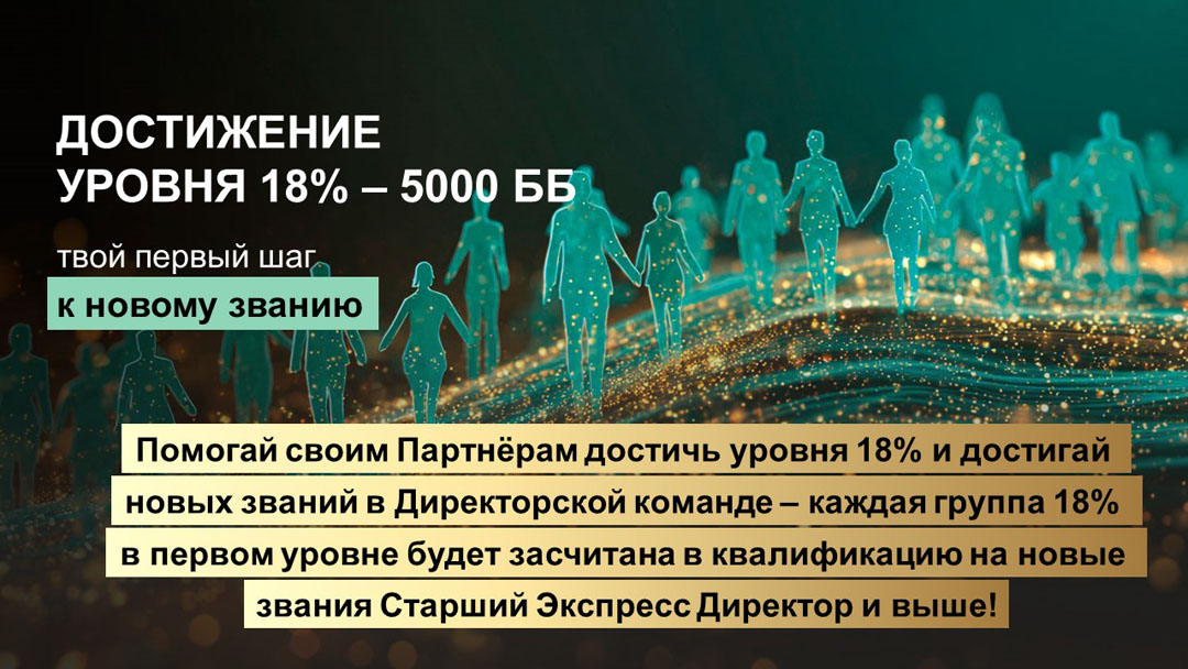 - Закрывайте новые звания в истории, подтверждая уровень 18% локально (5000 ББ в ПГ с отрывом от нижестоящего Бизнес Партнёра на один %-ный уровень и более) в рамках квалификационного периода.