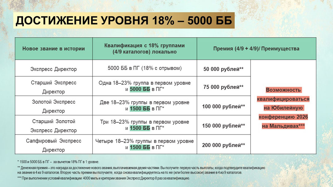 - не учитываются для достижения новых званий по стандартным условиям для Золотых Директоров и выше, выполнение индивидуального плана по группам на Юбилейную Конференцию 2026 на Мальдивах, в подтверждении звания Бриллиантовый Директор для автоматической квалификации (подробные условия опубликованы в материалах конференции).
