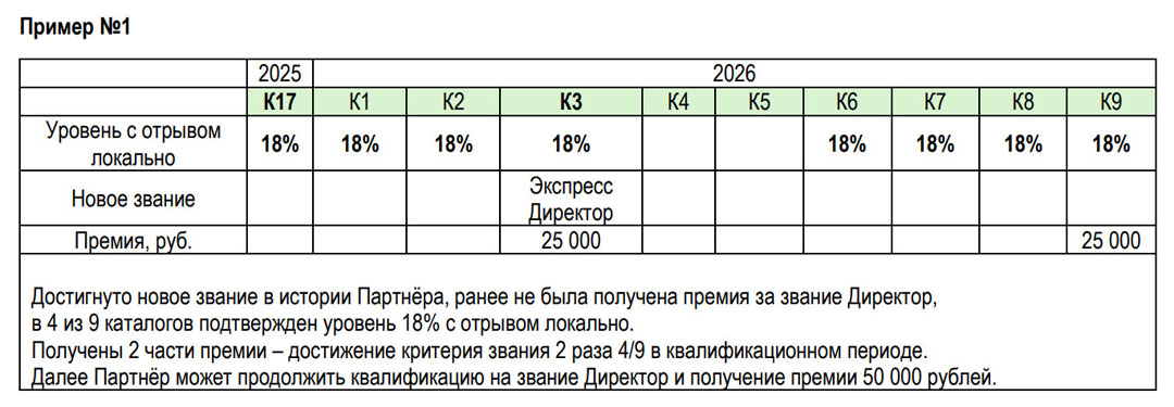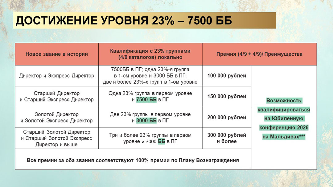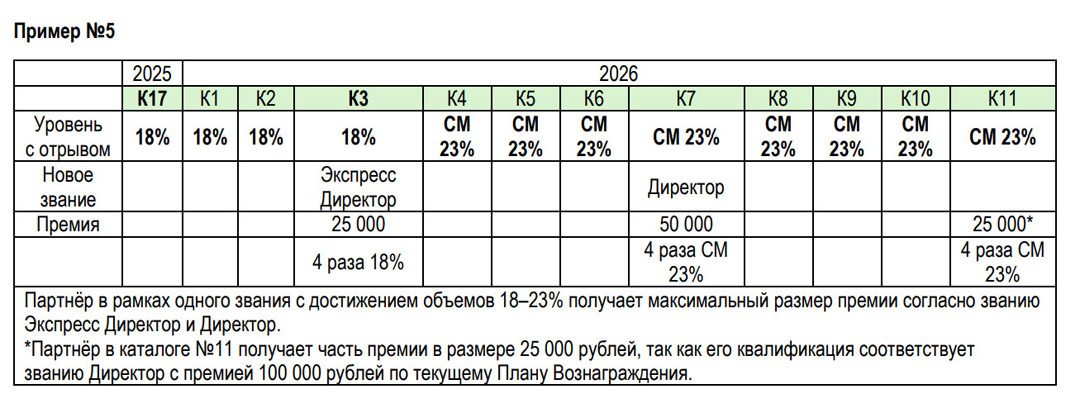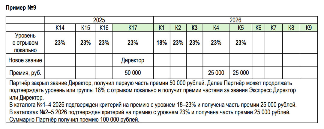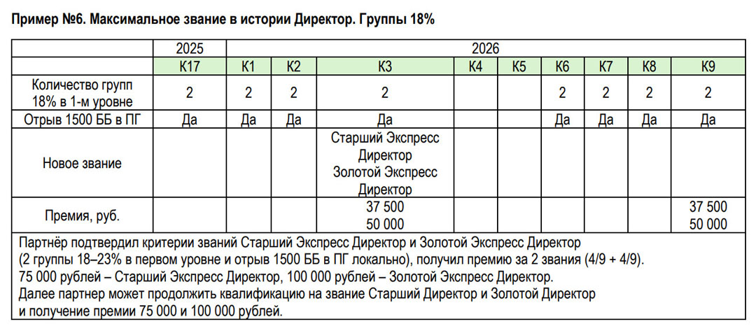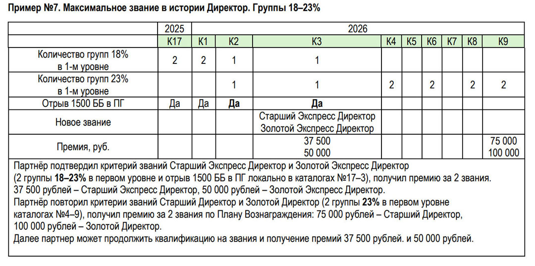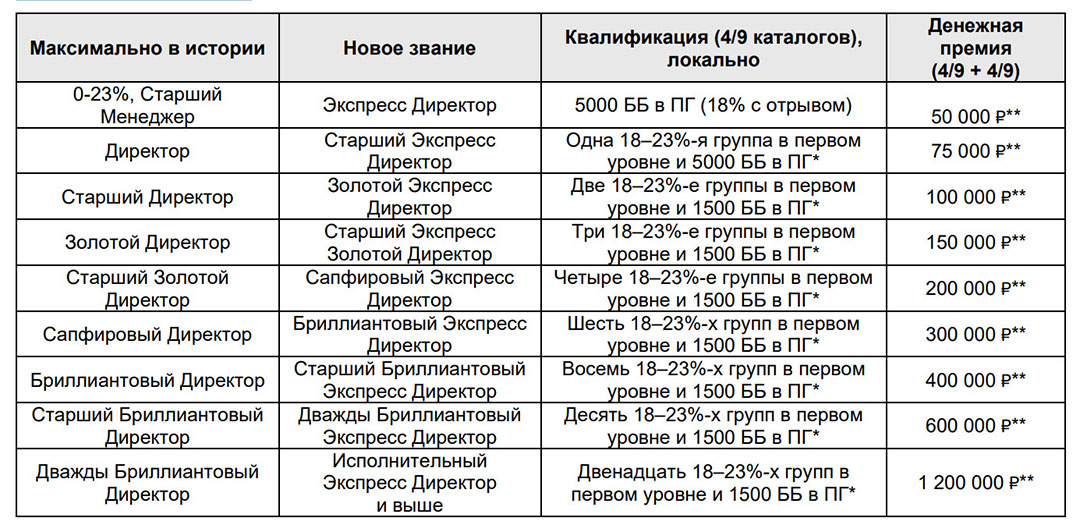 При достижении объемов 18–23%, а также групп 18%–23% партнер получает максимальный размер премии согласно Плану Вознаграждения, т. е. закрыв два звания Экспресс Директор и Директор партнер суммарно может получить не более 100 000 рублей, данное правило касается всех званий выше.