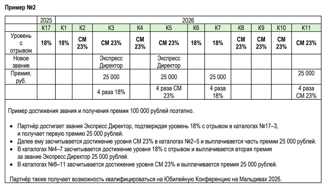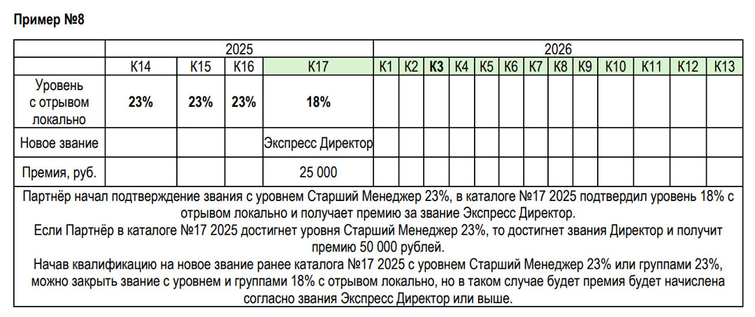 * 8 раз начиная с каталога №17 2025, если Партнёр с каталога №10 2025 по каталог №17 2025 ни разу не выходил на уровень Старший Менеджер.