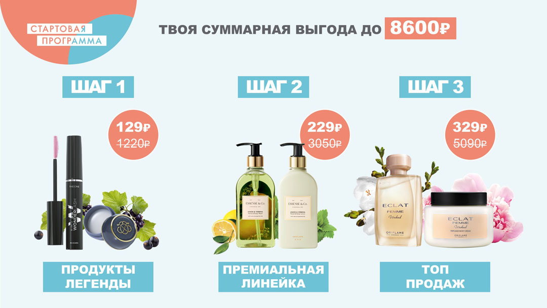 Присоединяйтесь к Oriflame, совершайте покупки от 30 ББ1 (~ 3 000 рублей) в трех периодах каталогов подряд и получайте Наборы продуктов Oriflame с выгодой до 8 600 рублей!