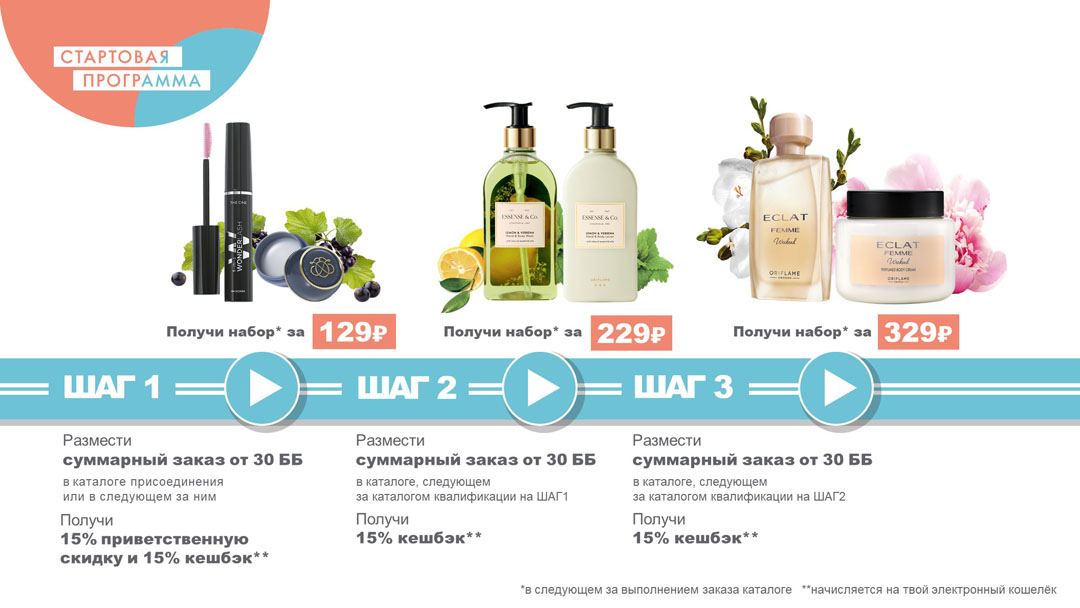 4 Набор продуктов за ШАГи 2 и 3 можно получить только при условии размещения суммарного заказа от 30 ББ в каждом из 2-х последующих каталогов подряд (без пропусков) после каталога квалификации на ШАГ 1. В случае пропуска выполнения условий квалификации в любом из этих каталогов участие в Стартовой программе прекращается (т.е. невозможно получить Набор за ШАГ 2, если пропущена квалификация на ШАГ 1, а также невозможно получение Набора за ШАГ 3, если пропущена квалификация на ШАГ 1 или ШАГ 2).